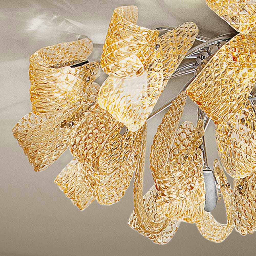Elegante en majestueuze plafondlamp gemaakt in Italië van handgemaakt Venetiaans glas met amberkleurige afwerking en details van gepolijst chroommetaal . Een idee van verlichting samengesteld uit wulpse linten en ongebruikelijke texturen die zijn esthetische originaliteit en een gevoel van dynamiek geven . Wat opvalt is de geometrische textuur die het glazen oppervlak bedekt waarop het licht wordt gereflecteerd in de metalen details voor een prachtig spel van reflecties . Het resultaat is een prachtige plafondlamp die zich kan aanpassen aan elke hedendaagse omgeving en karakter kan geven aan meer klassieke ruimtes, die bijzonder veelzijdig blijkt te zijn.