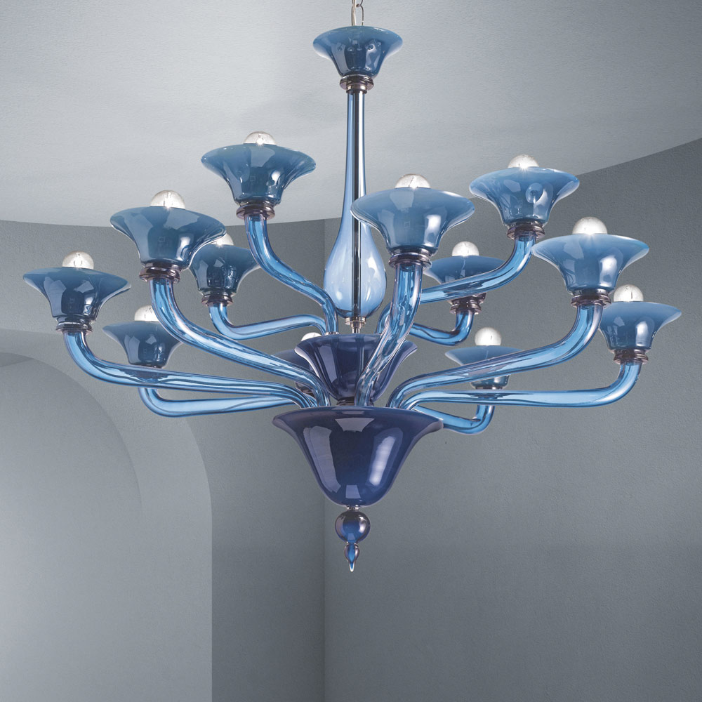 Handgemaakte 12-lichts kroonluchter in blauw Venetië-glas Gemaakt in Italië.