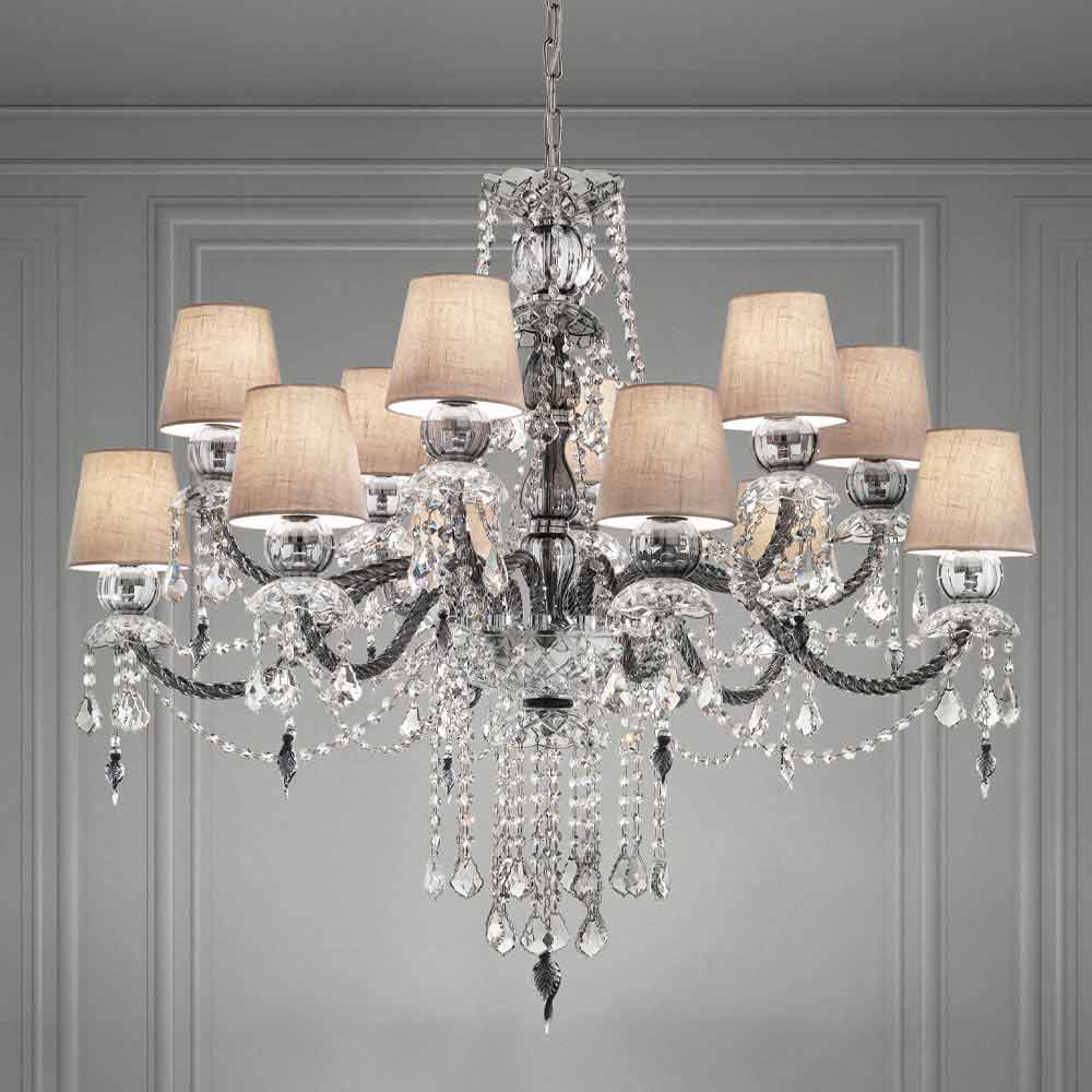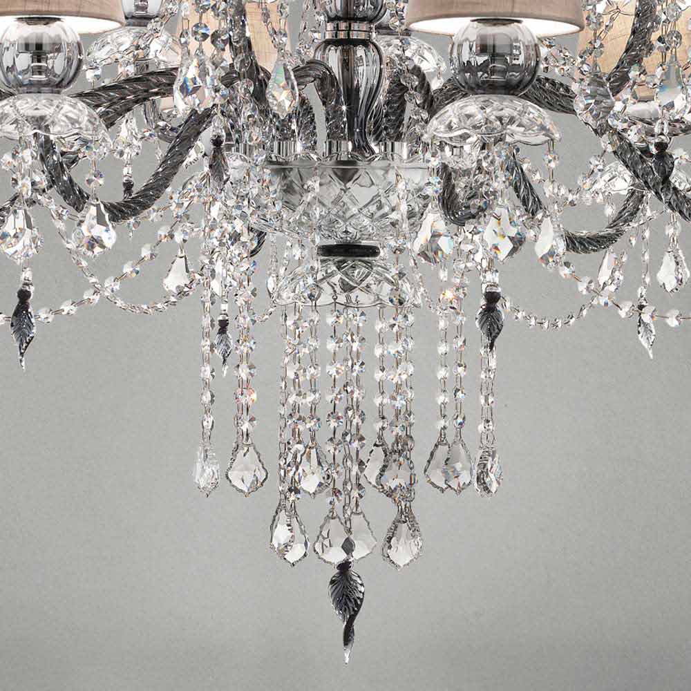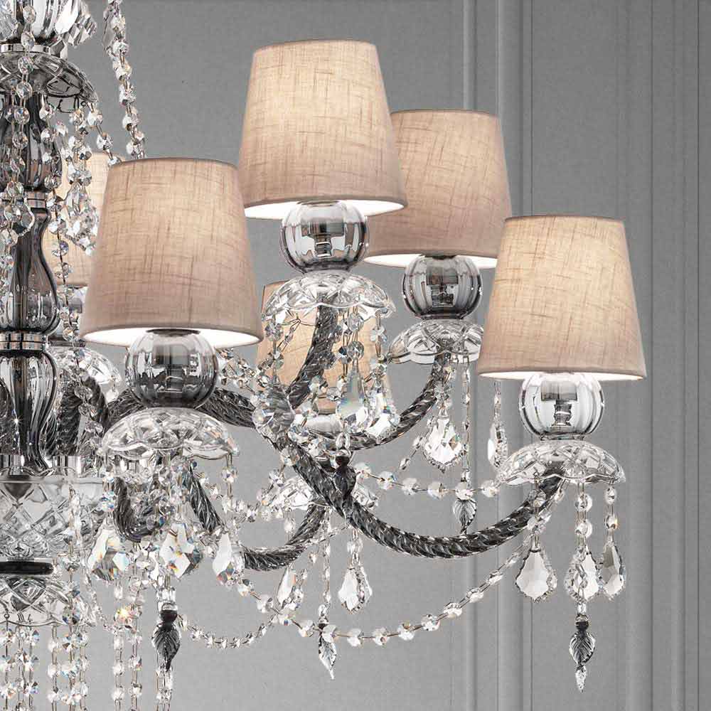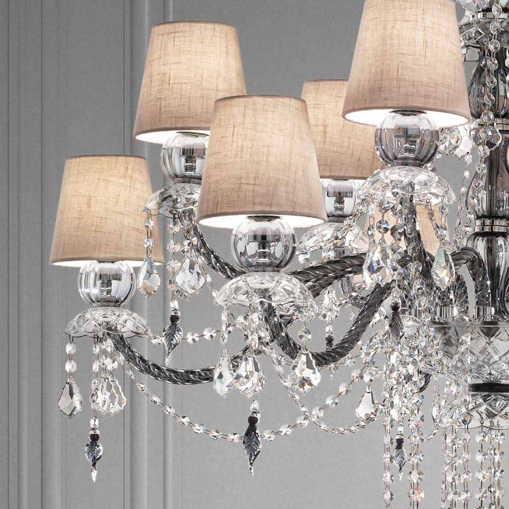 Elegante en imposante kroonluchter met 12 linnen lampenkappen , structuur in grijze Venetiaanse glasafwerking verrijkt met hangers in kristalafwerking en details in gepolijst chroom metaal , handgemaakt in Italië . Gekenmerkt door een romantisch karakter dat grote kamers op een exclusieve manier kan vullen, valt deze kroonluchter op dankzij lichtgevende hangers en verfijnde lampenkappen die leven geven aan een dynamische inrichtingsoplossing met een sterke scenografische impact . Om zijn waarde te vergroten en zijn esthetische kant te onderstrepen, is de aanwezigheid van pailletten die, door de breking van licht, prachtige licht- en schaduwspelletjes tot leven brengen dankzij ongekende gekleurde flitsen .