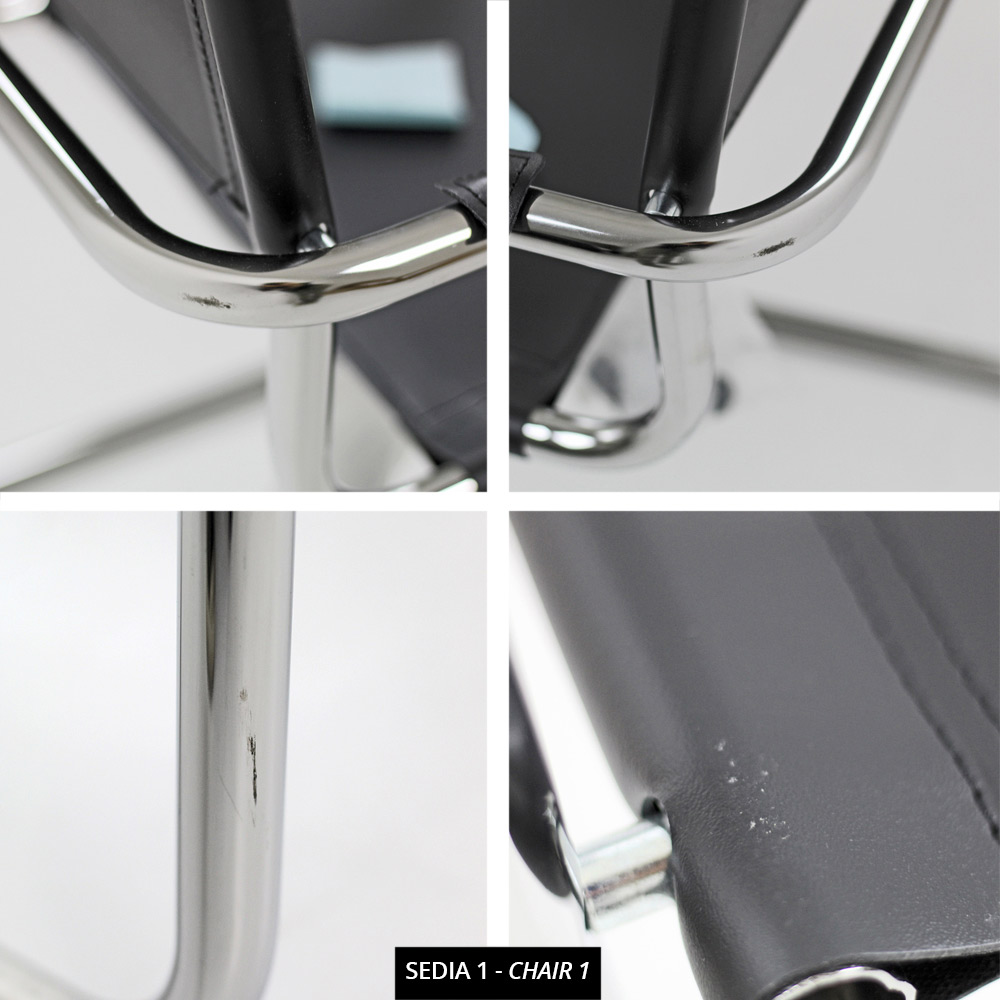 Moderne vergader- of conferentiestoel in verchroomd metaal en zwart kunstleder.