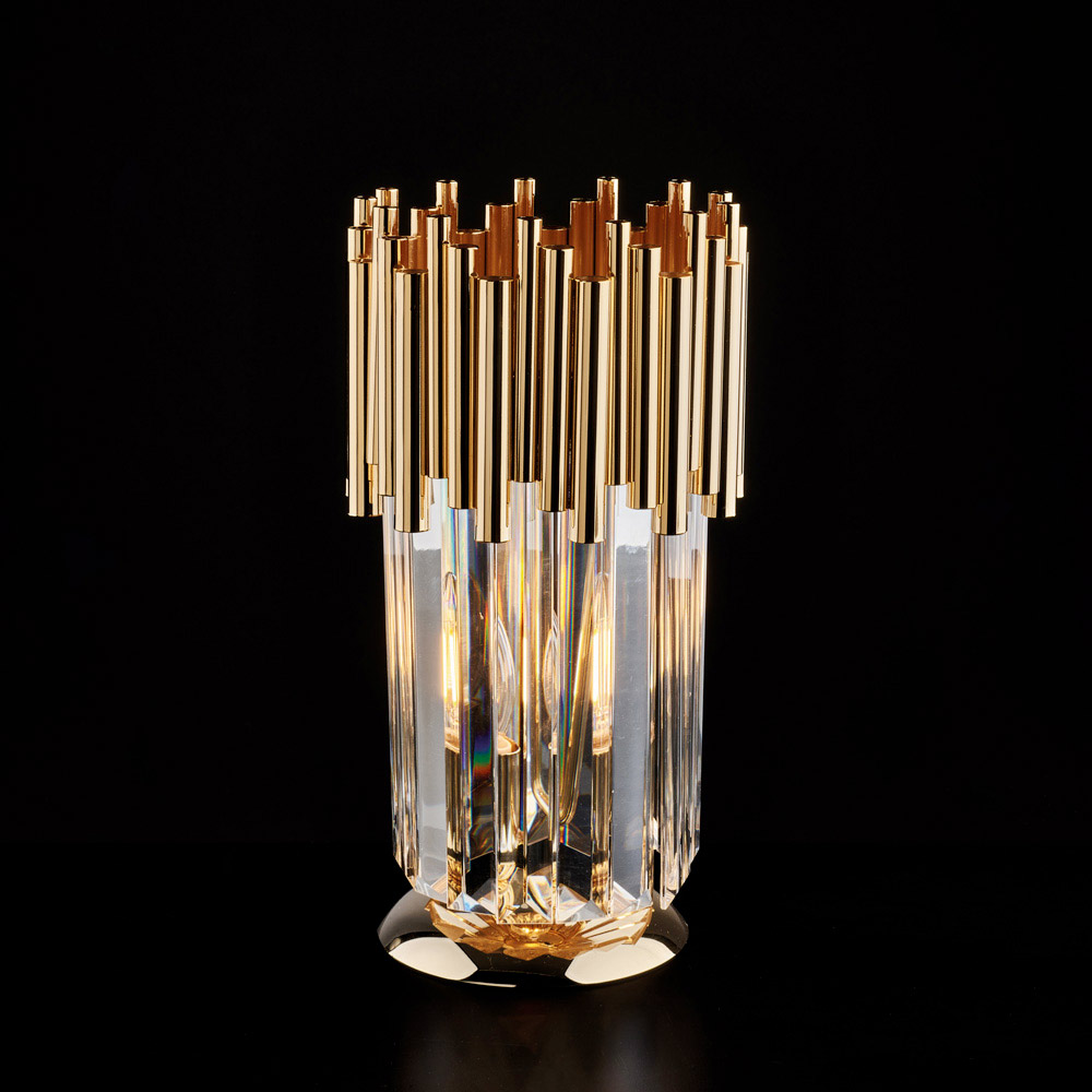 Elegant en kostbaar, deze luxe vergulde ijzeren tafellamp met strass-steentjes is een verfijnd verlichtingsaccessoire dat ruimtes verfraait met een warm, dramatisch licht. De verticale structuur, met cilindrische gouden elementen afgewisseld met heldere strass-steentjes , creëert een betoverend spel van reflecties dat de ruimte versterkt, zelfs wanneer het licht uit is.