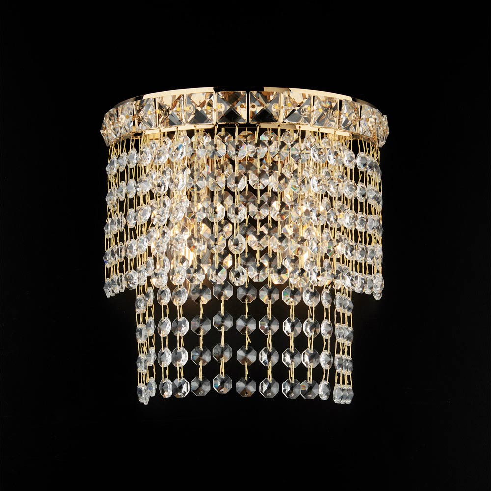 Elegant en oogverblindend, deze luxe wandlamp van ijzer en verguld messing met strass-steentjes is een verfijnd verlichtingselement dat ontworpen is om muren te verfraaien met een warm, omhullend licht. De compacte structuur, versierd met cascades van glinsterende strass-steentjes , creëert een suggestief spel van reflecties dat de ruimte een verfijnde en charmante sfeer geeft.