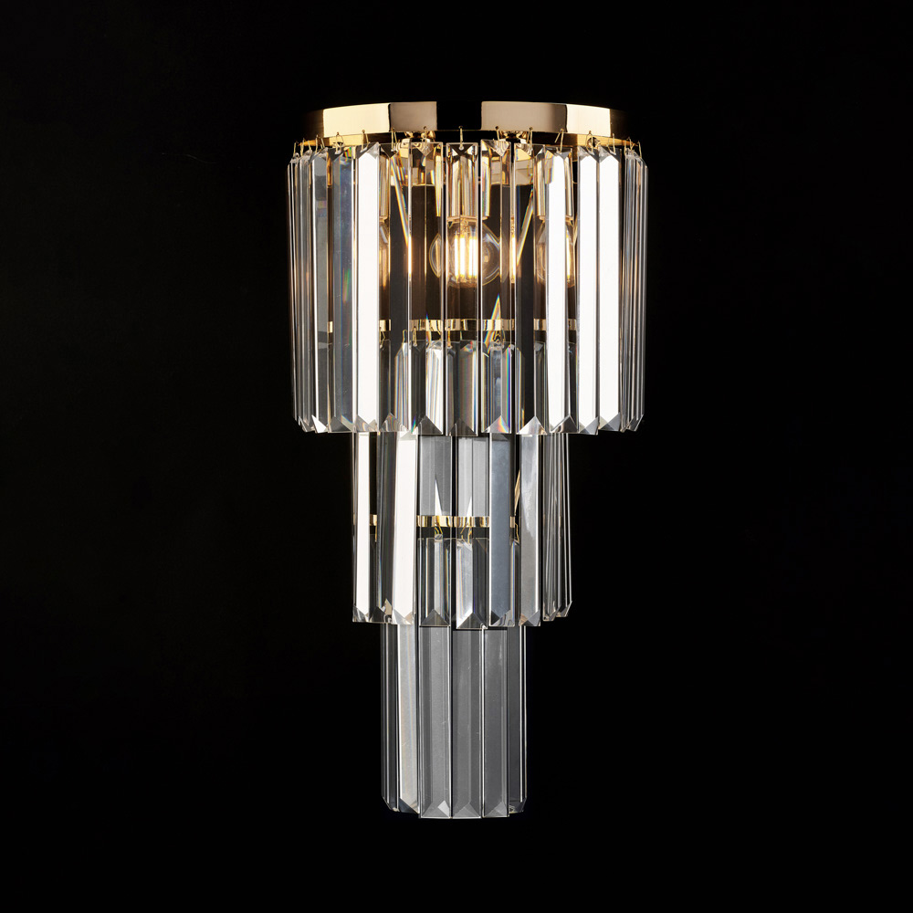 Elegant en indrukwekkend, deze luxe wandlamp van ijzer en verguld messing met strass-steentjes is een verfijnd verlichtingselement dat is ontworpen om muren te verfraaien met een warm, omhullend licht. De verticale structuur, opgebouwd uit meerdere niveaus, is versierd met transparante strass-steentjes die een geraffineerd spel van reflecties creëren en de ruimte diepte en karakter geven.