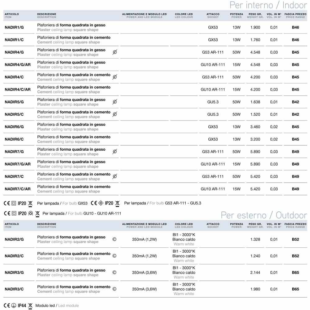 Moderne vierkante LED-plafondlamp voor buiten Nadir 2 van Aldo Bernardi , verkrijgbaar in beton- of gipsversie.