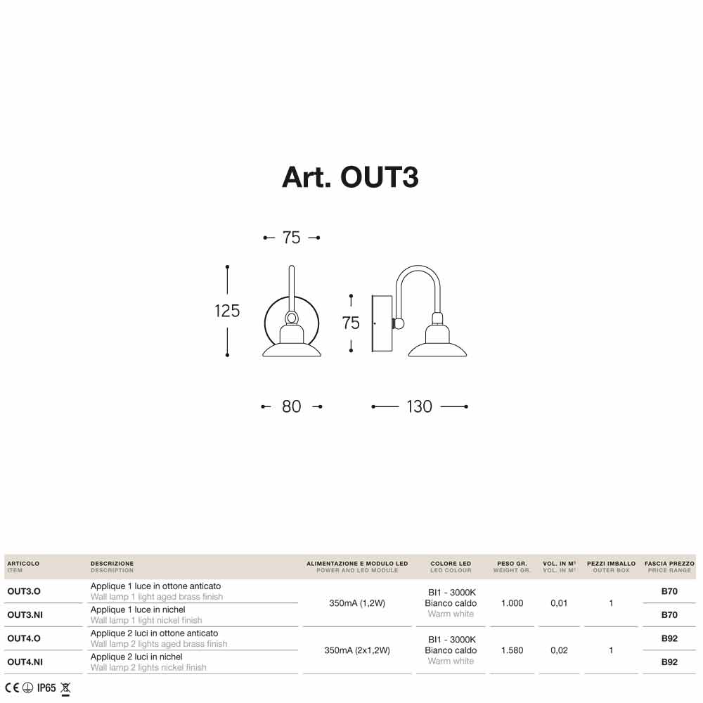 Design wandkandelaar Bugatti van Aldo Bernardi, verkrijgbaar met nikkel of antiek messing afwerking.