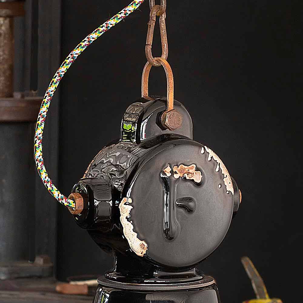 De eigenaardigheid van deze lamp ligt in het vakmanschap van de keramische diffuser. Het keramiek is in feite zo gedecoreerd alsof de tijd zijn pad had gemarkeerd. De reproductie van de erosie van de tijd in combinatie met de glanzende oppervlakken geven die extra waarde aan deze ophanging. Dit doorleefde effect geeft Angela een verfijnde vintage-industriële stijl. De metalen structuur versterkt het antieke effect nog meer.