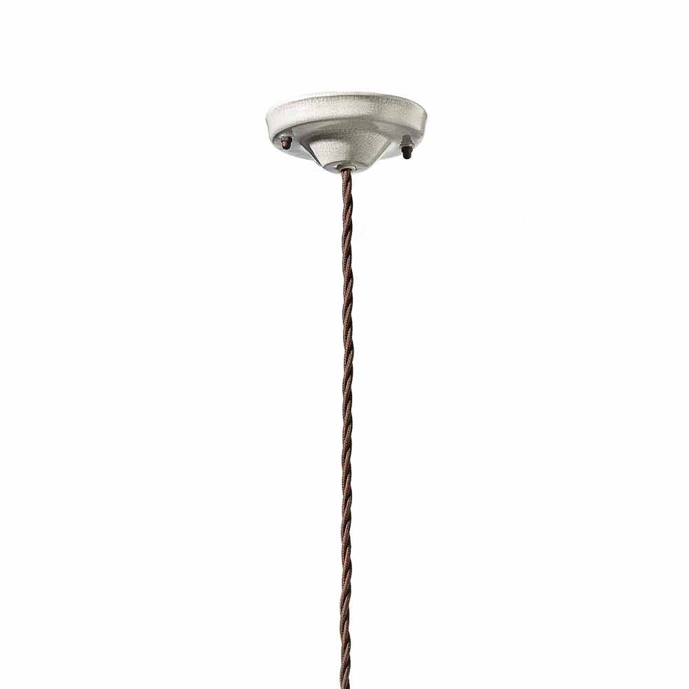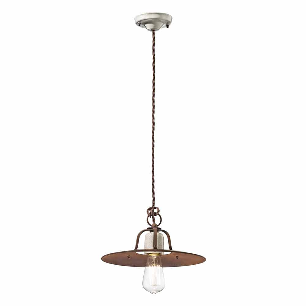 Brede kroon en eenvoudig in hoogte verstelbaar dankzij de gevlochten kabel die de industriële stijl compleet maakt. Mat roestig metaal en keramische details om een balans tussen volle en lege vormen te voltooien. Het is geïnspireerd op de Amerikaanse rustieke stijl. Deze lamp, met zijn vage kleuren en een doorleefde smaak, is eenvoudig en tijdloos. Puur licht zonder afscherming.
