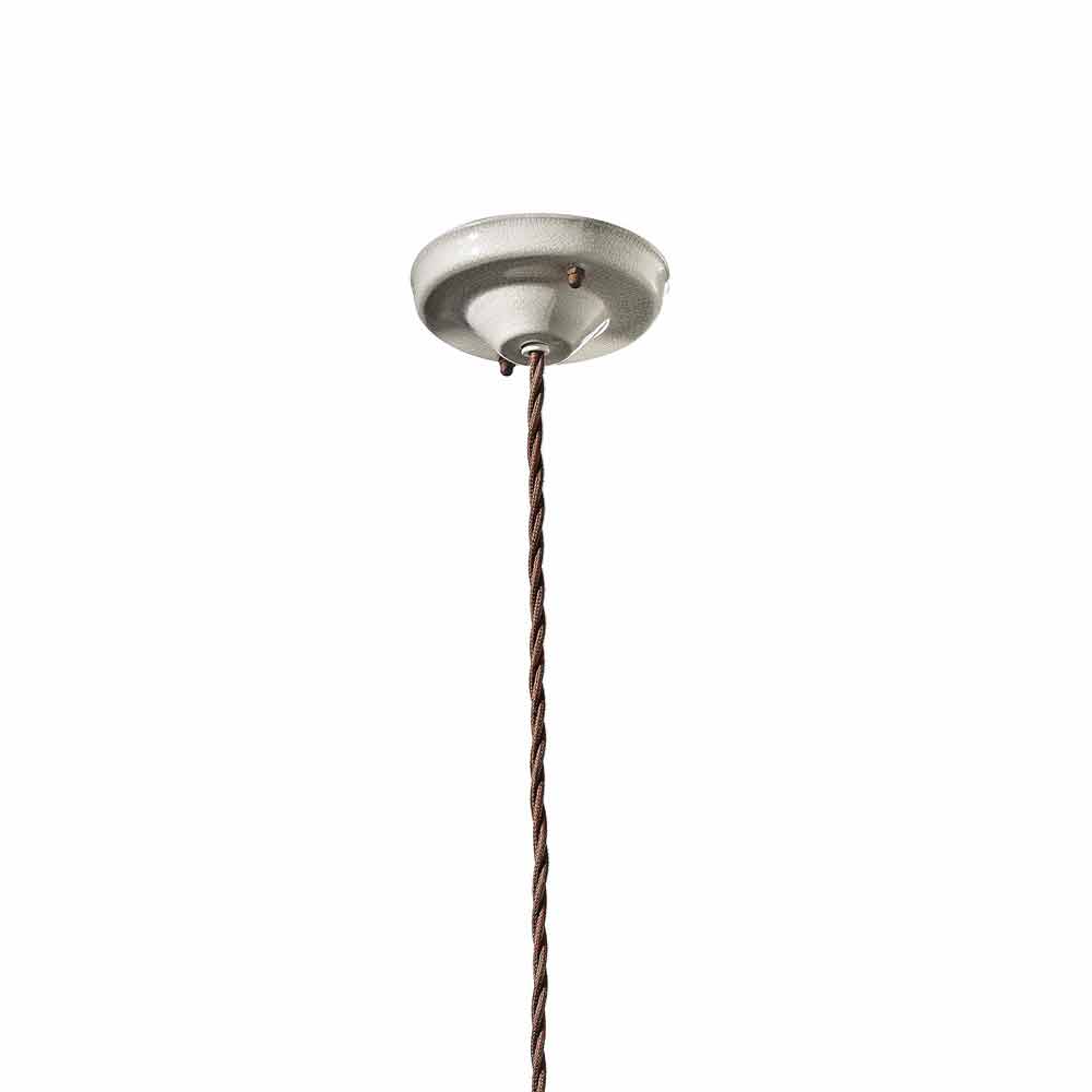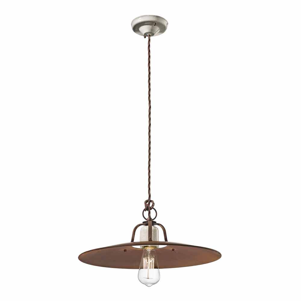 Brede kroon en eenvoudig in hoogte verstelbaar dankzij de gevlochten kabel die de industriële stijl compleet maakt. Mat roestig metaal en keramische details om een balans tussen volle en lege vormen te voltooien. Het is geïnspireerd op de Amerikaanse rustieke stijl. Deze lamp, met zijn vage kleuren en een doorleefde smaak, is eenvoudig en tijdloos. Puur licht zonder afscherming.