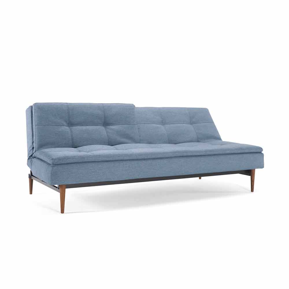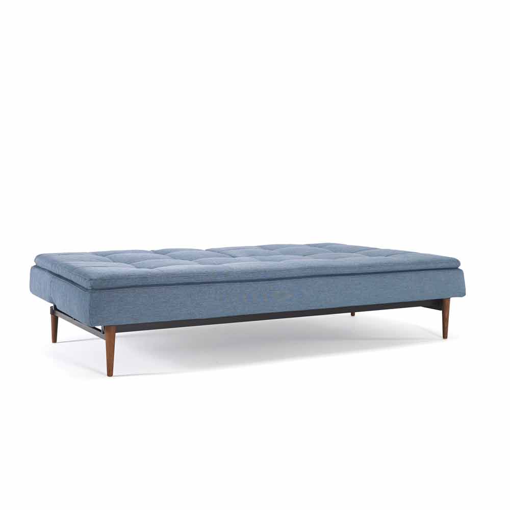 Blauwe slaapbank met Scandinavisch design verstelbaar in 3 standen Dublexo van Innovation, voeten in donker hout, mat zwarte structuur.