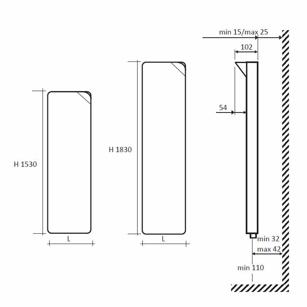 - H 1530 x L 375 x Inter. 50 x P 48 mm x Uitgang w (Δt50 °) 385; Opbrengst w (At30 °) 197; Opbrengst w (At26 °) 166