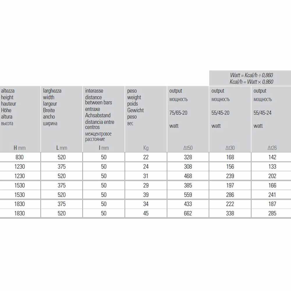 - H 1830 x L 520 x Inter. 50 x P 48 mm x Uitgang w (Δt50 °) 662; Opbrengst w (At30 °) 338; Opbrengst w (At26 °) 285