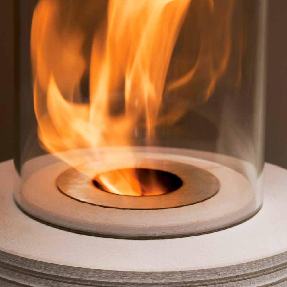 Deze mooie biocamino is inclusief een spatbord uit boorsilicaatglas dat een elegante glazen buis die de vlam zelf bevat lijkt.