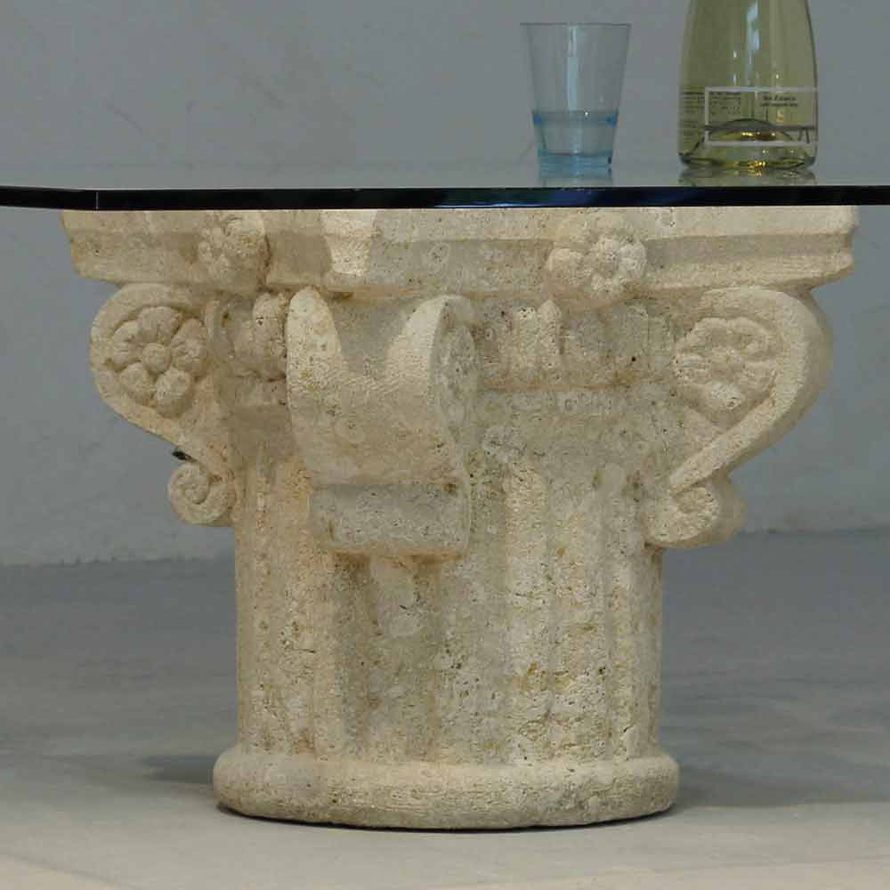 Klassieke vierkante salontafel Made in Italy met centrale basis in natuurlijke Vicenza-steen, met de hand gesneden uit het massieve blok en met een 12 cm dikke floatglas top, rustend op de basis.