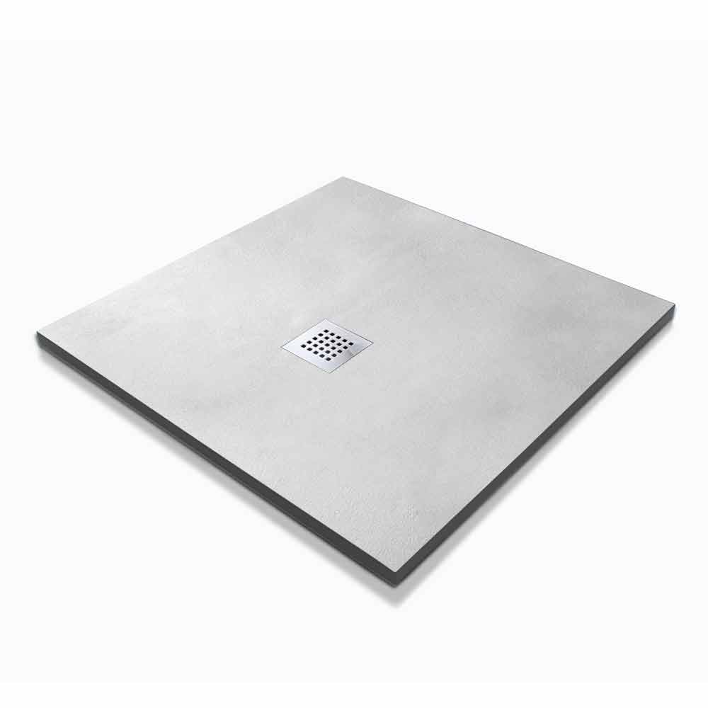 Moderne vierkante douchebak van kunsthars met afwerking in betoneffect.