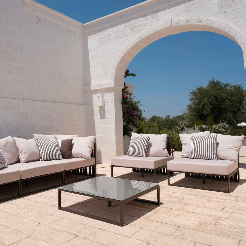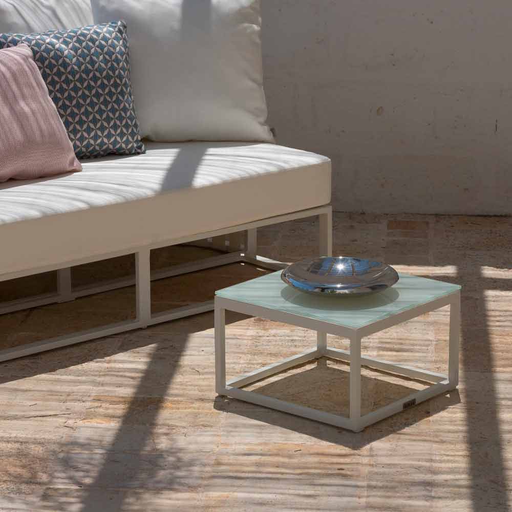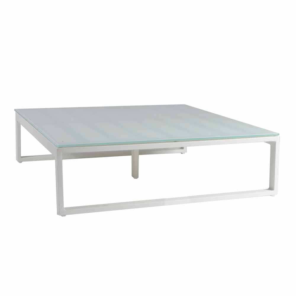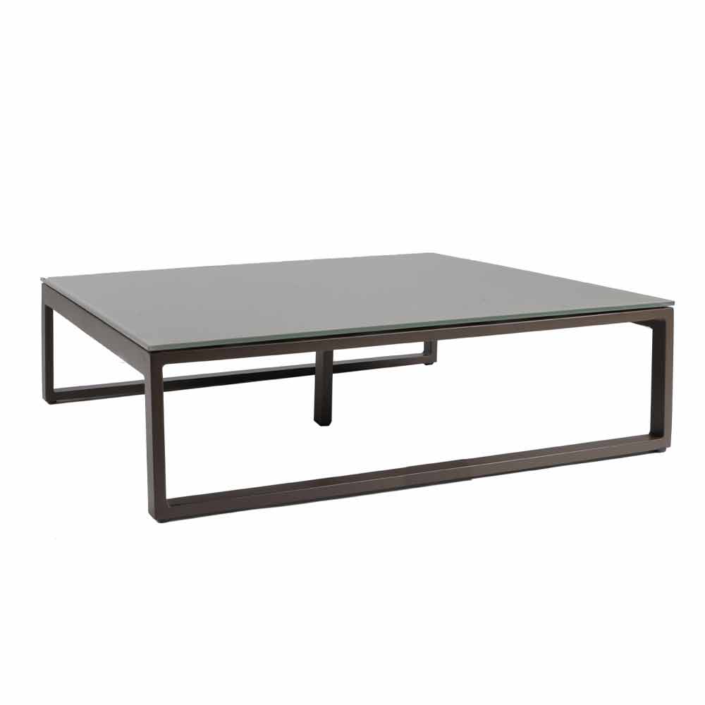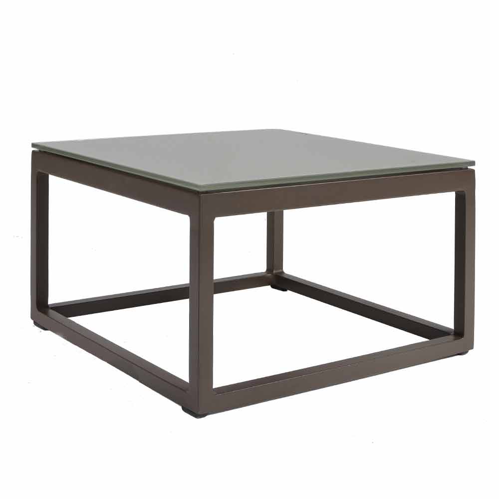Lage buitentafel met aluminium structuur in 3 afwerkingen en vierkant blad van glas of laminaat.