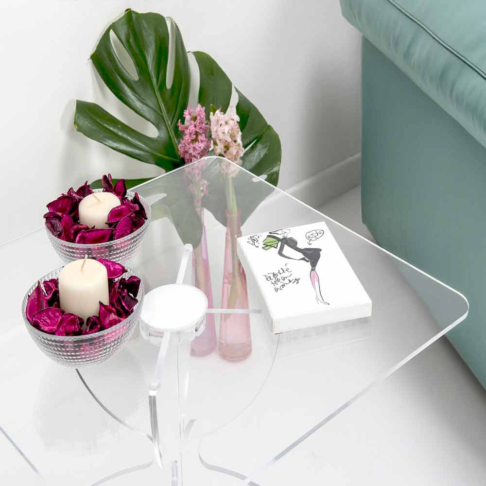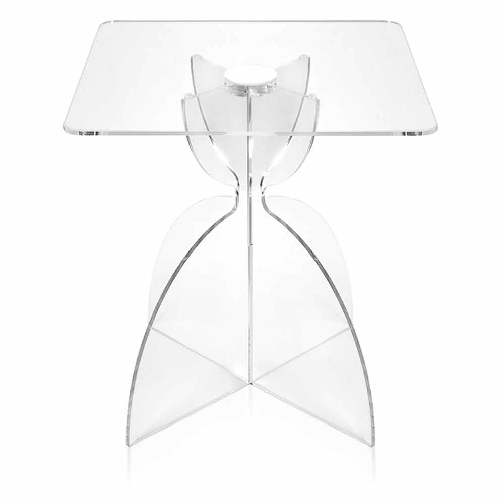 Vierkante kleine tafel in transparant plexiglas, Lamon De vierkante kleine tafel LAMON heeft een Noord-Europese toon. De transparante, met laser gegoten voet van plexiglas herinnert aan de Keltische stijl en geeft een exotische vleugje elegantie aan de huiselijke ruimte. Zowel de basis als het oppervlak zijn van acrylisch PMMA van acryl 100% van nieuw polymeer. De fysisch-technische kenmerken van het plexiglas (schokbestendig, niet-vervormbaar, onveranderbaar, thermisch isolerend) maken de kleine tafel geschikt voor zowel binnen als buiten. De helderheid en schittering worden in de loop van de tijd onveranderd en ongewijzigd bewaard. Het gebruikte PMMA-plexiglas van nieuw polymeer is niet-toxisch, hypoallergeen, geurloos en antibacterieel. 100% recyclebaar. Dacht, ontworpen en gemaakt in Italië met Italiaanse materialen.