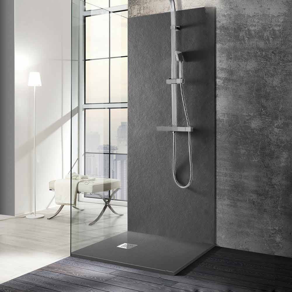 Moderne vierkante douchebak 80x80 in hars in steen en staaleffect.
