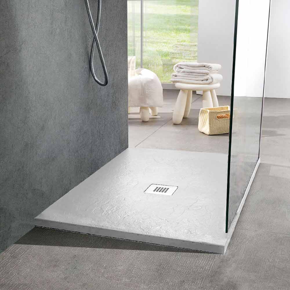 Moderne vierkante douchebak 80x80 in hars in leisteeneffect.