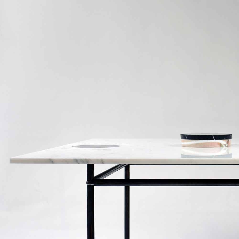 Zo ontstaat een origineel meubelaccessoire met een diepe boodschap, die wordt gekenmerkt door de aanwezigheid van een gat in het centrale gedeelte van het blad waarin de verhoogde vaas van gelaagd marmer met verschillende afwerkingen kan worden geplaatst.