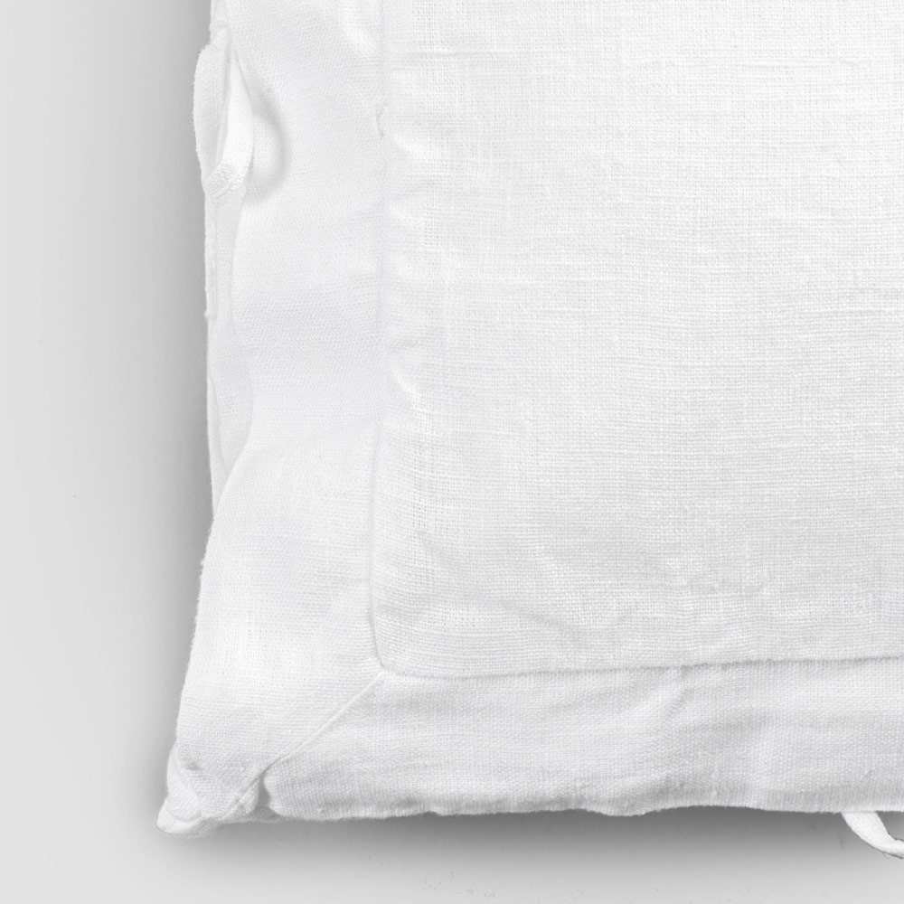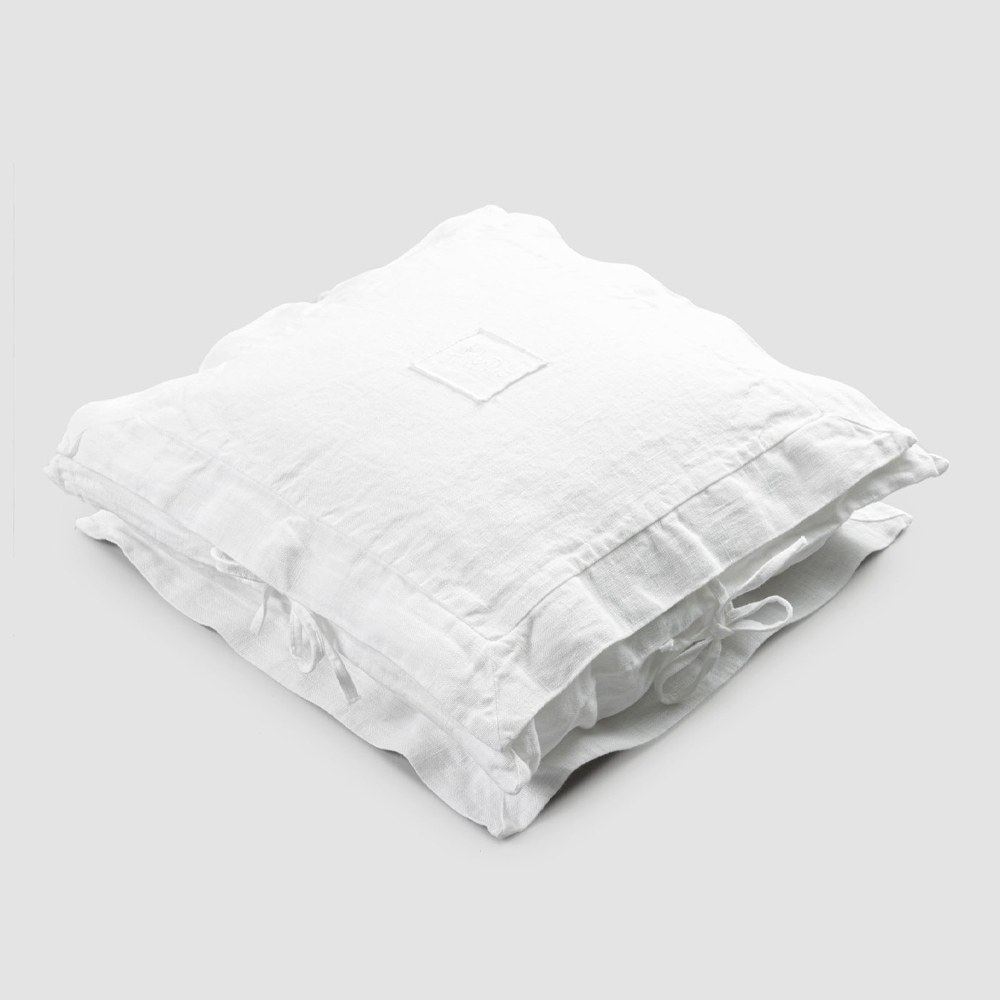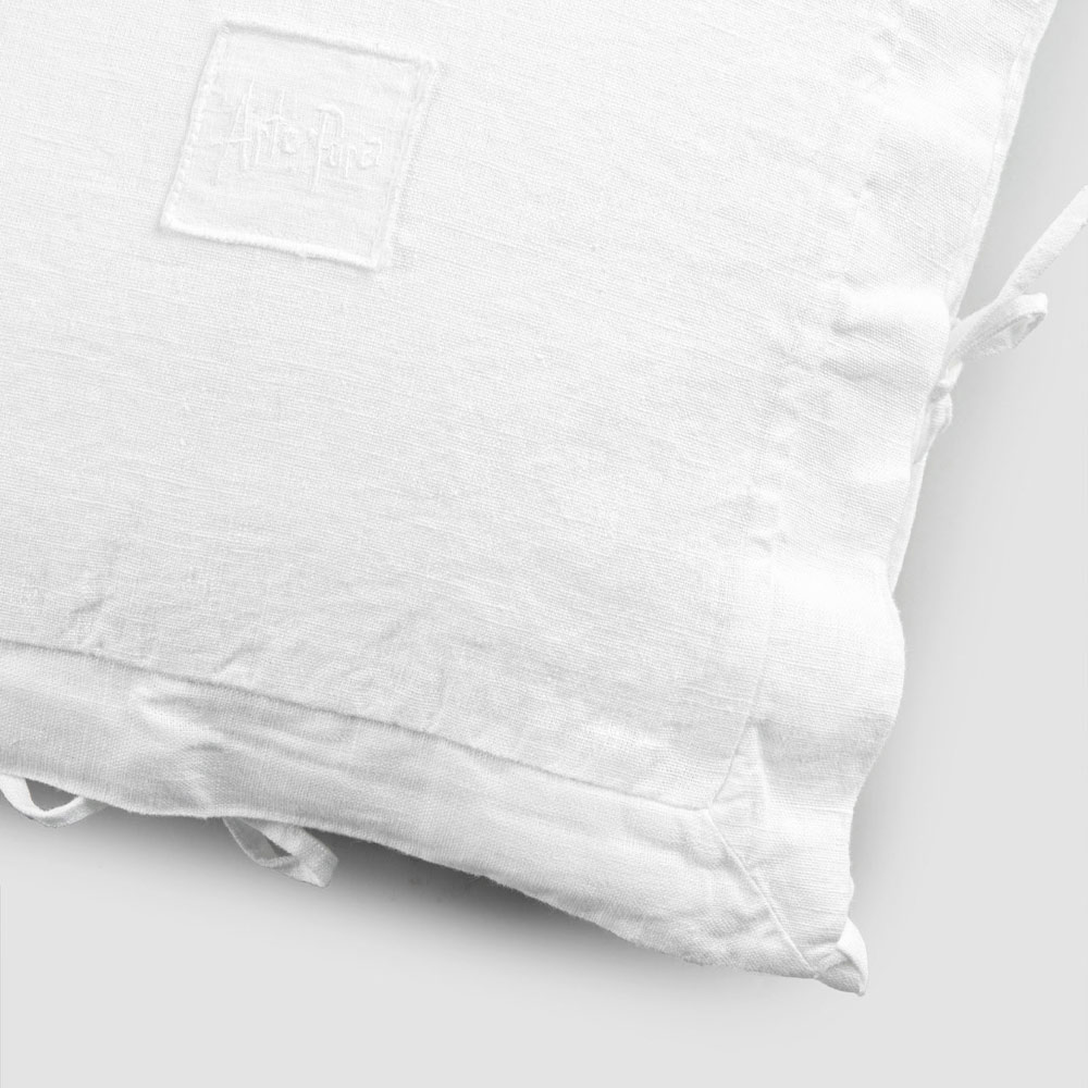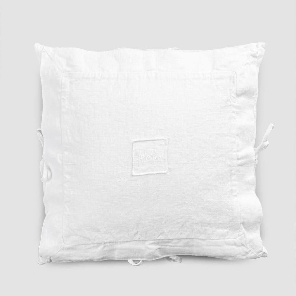 De waarde van traditie voegt zich bij de moderne levensstijl met deze zware kussensloop van wit linnen met vierkante decoratie en banden aan de zijkanten.