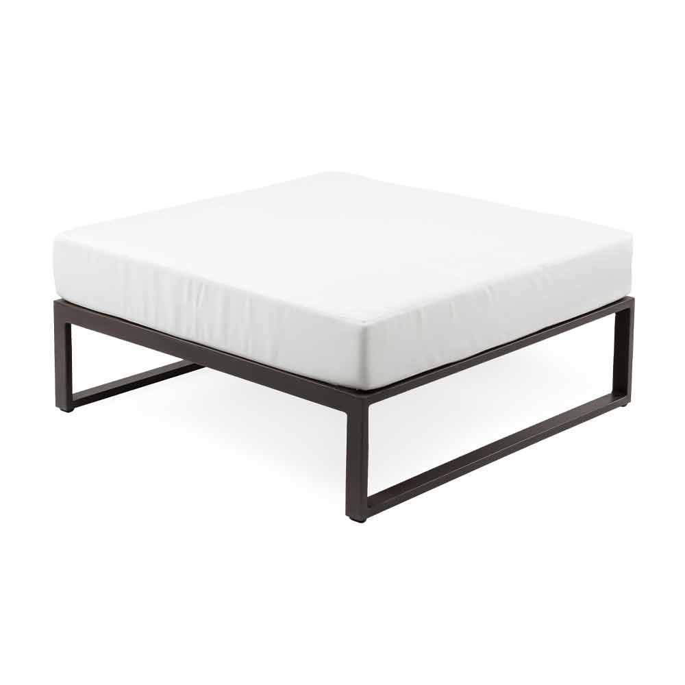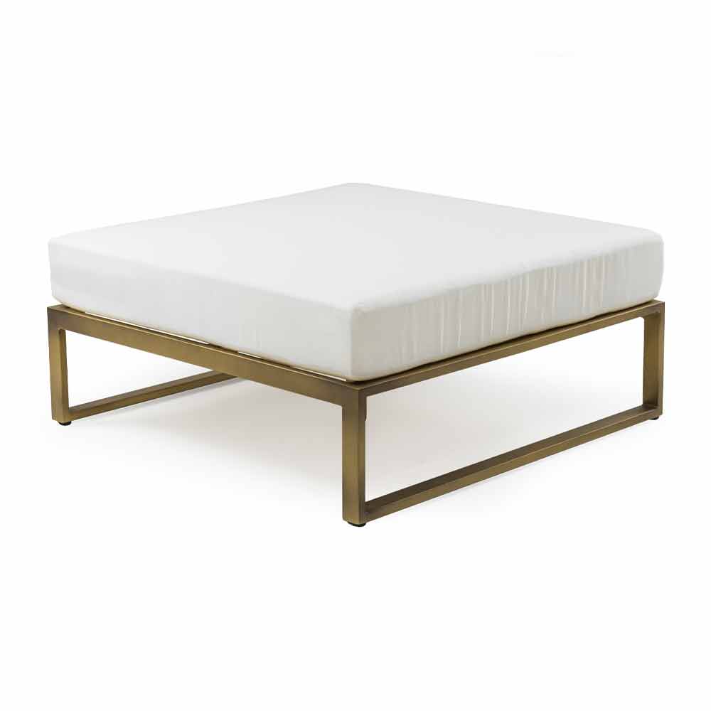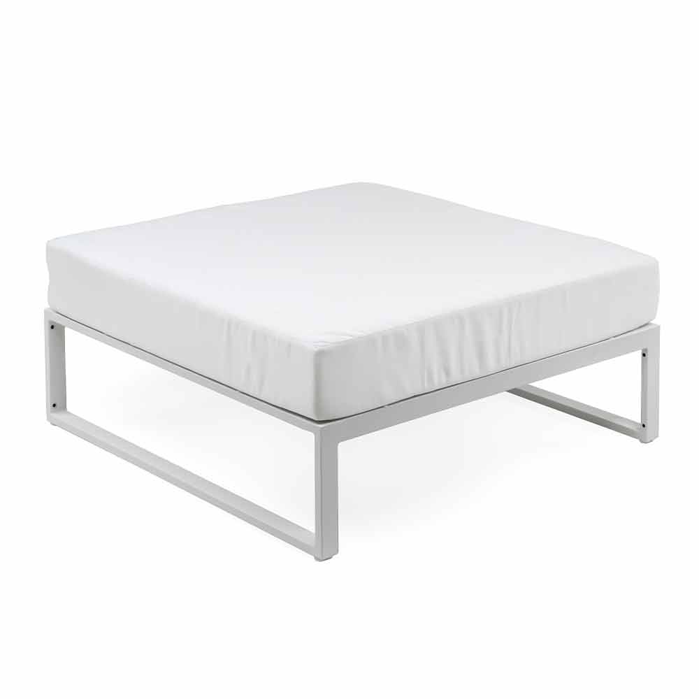 Vierkante poef voor de buitenwoonkamer met aluminium structuur in 3 afwerkingen en wit stoffen kussen, luxe design.