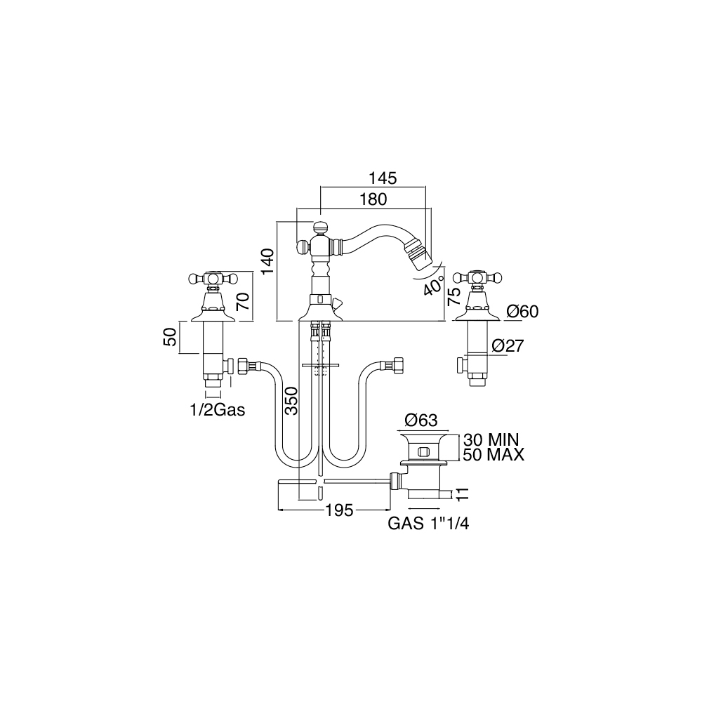 Vintage design 3-gats bidet kraan gemaakt in Italië van messing.
