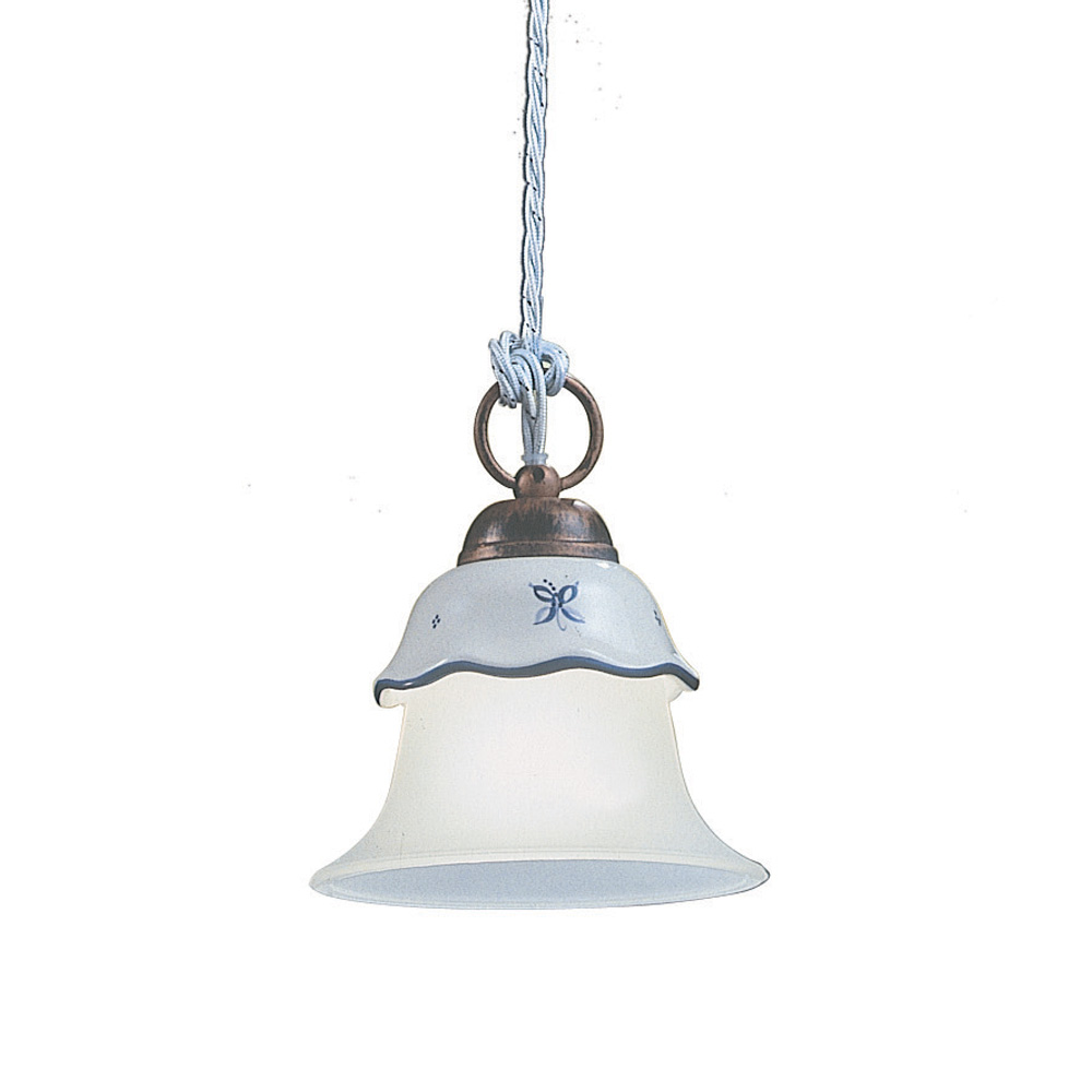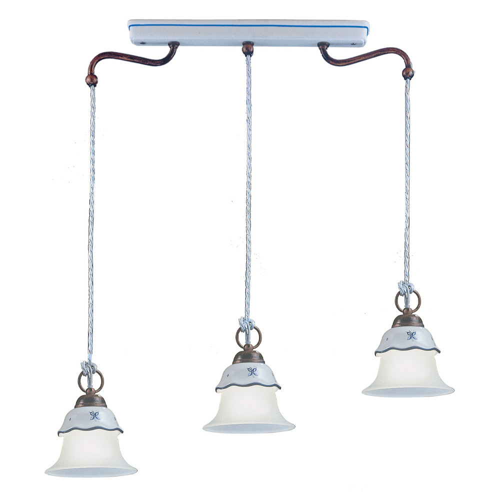 Hanglamp 3-lichts in ijzer, met de hand gedecoreerd keramiek en met zuur geëtst glas gemaakt in Italië door Ferroluce.