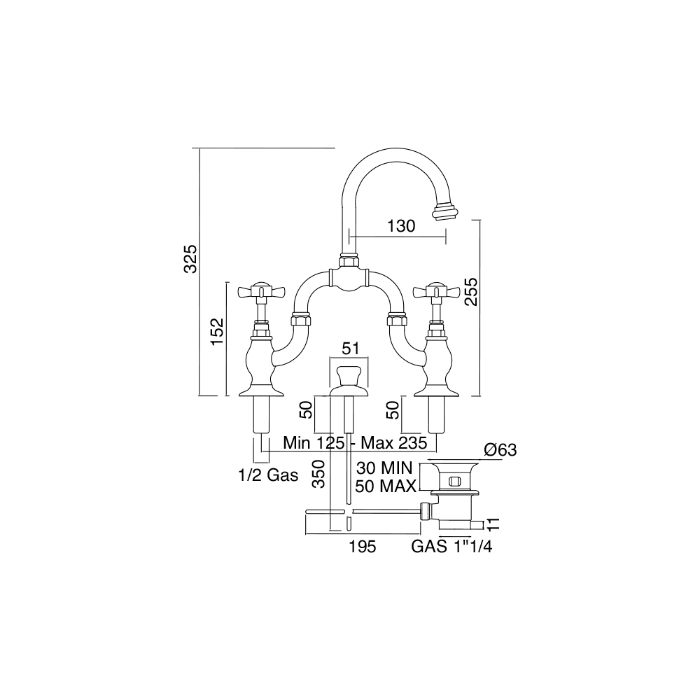 bruggroep voor wastafel 2-3 gaten met afvoer, verstelbare hartafstand en scharnierende uitloop.
