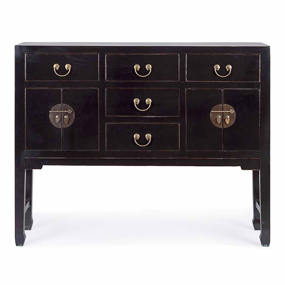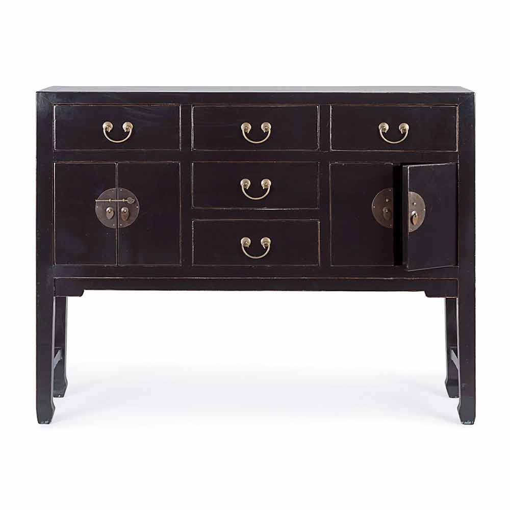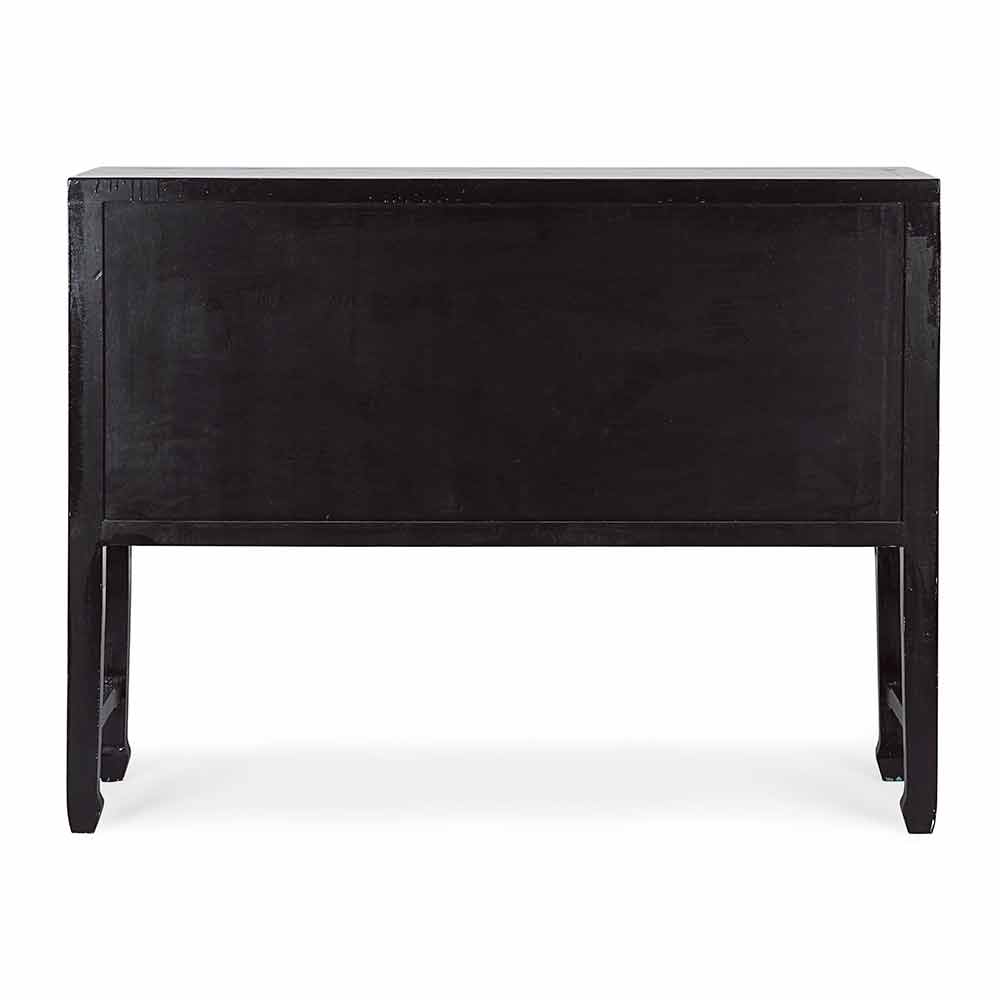 Zwarte console tafel in iepenhout met 5 lades en 4 deuren in vintage design.