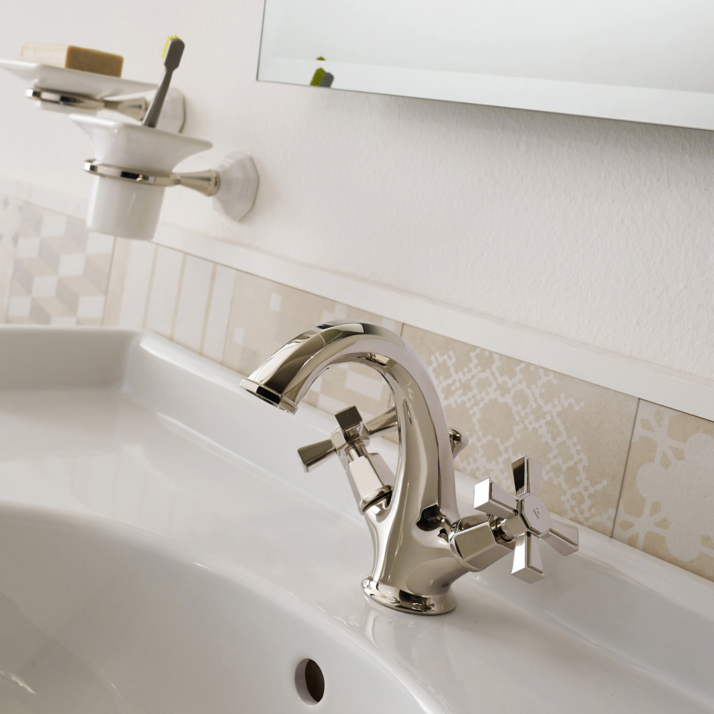 De Silvana è collectie wordt gekenmerkt door zeshoekige vormen en oppervlakken waarvan de facetten het licht op een originele manier weerkaatsen en de omgeving verlichten. De stijl is duidelijk geïnspireerd op de kunstDéco. Deze lijn van luxe badkamerkranenè is ontworpen om te worden gecombineerd met vintage en verfijnd design badkuipen, wastafels, douches en bidets.