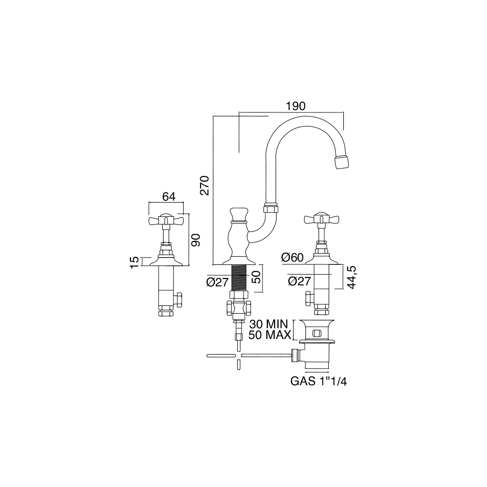wastafelkraan met hoge uitloop, drie gaten en afvoer.