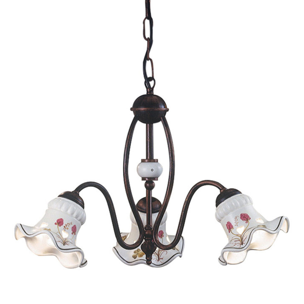 Woonkamerkroonluchter met 3 of 5 lampen in met de hand gedecoreerd ijzer en keramiek, gemaakt in Italië door Ferroluce.