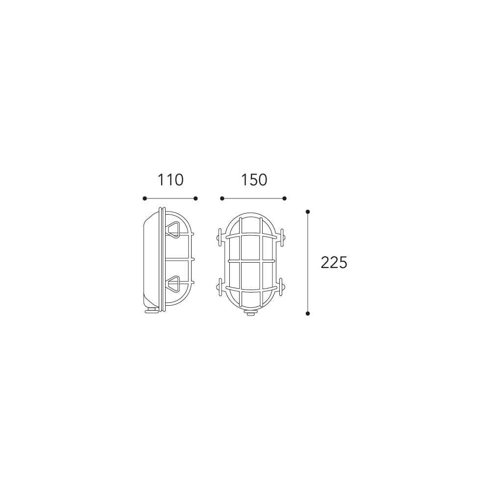 De ovale diffuser , verkrijgbaar in helder of opaalglas , wordt beschermd door een robuust metalen rooster dat doet denken aan de maritieme en industriële wereld, en tegelijkertijd veiligheid en duurzaamheid garandeert. Het licht is functioneel en omhullend , perfect voor het verlichten van gevels , ingangen , buitentrappen en buitenruimtes .