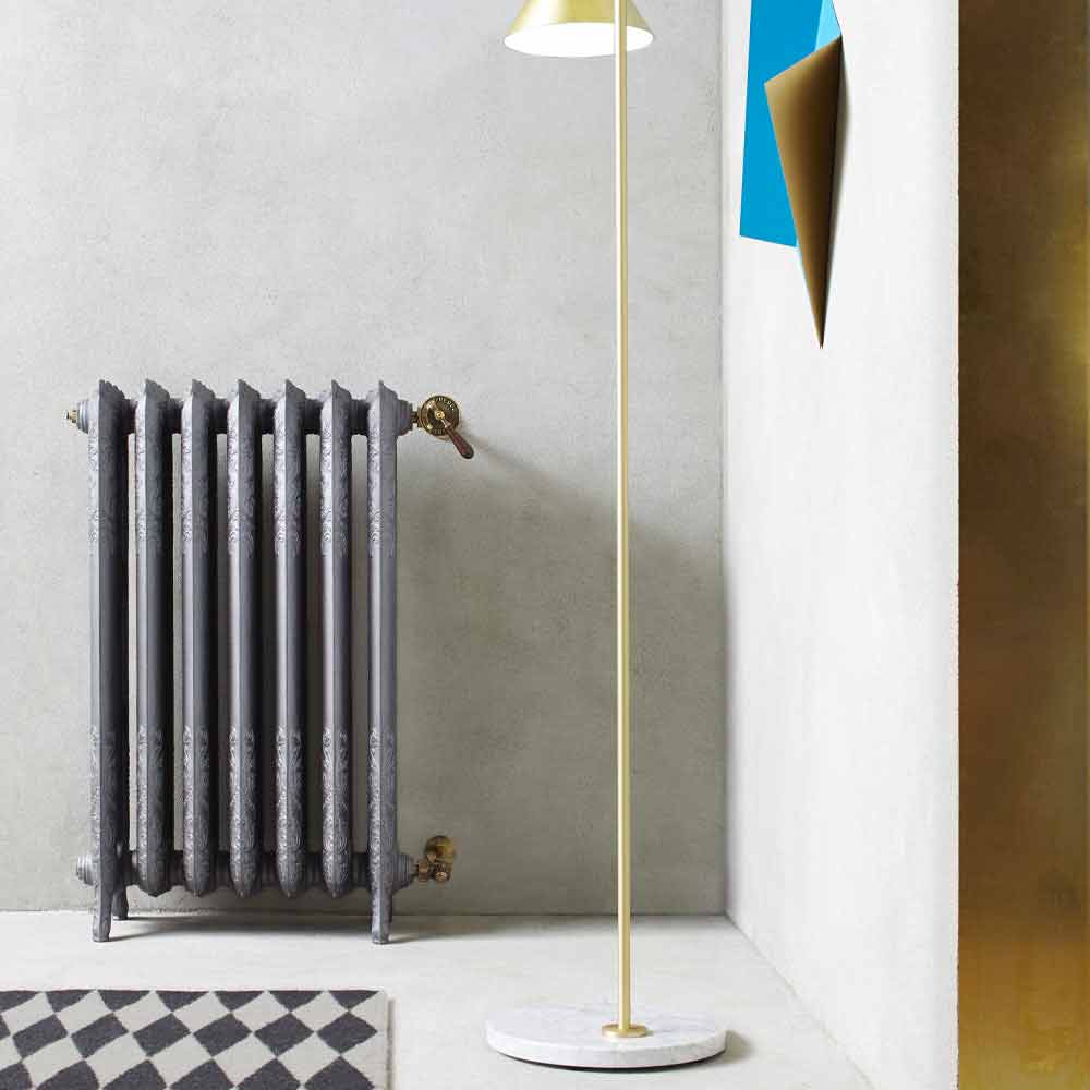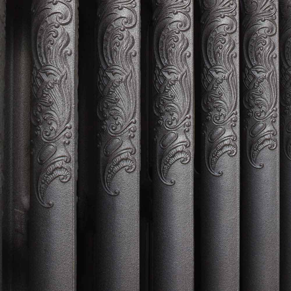 Hydraulische design vloerradiator in barokstijl in gietijzer met 2 kolommen en 7 gedecoreerde elementen.