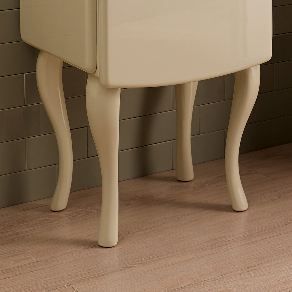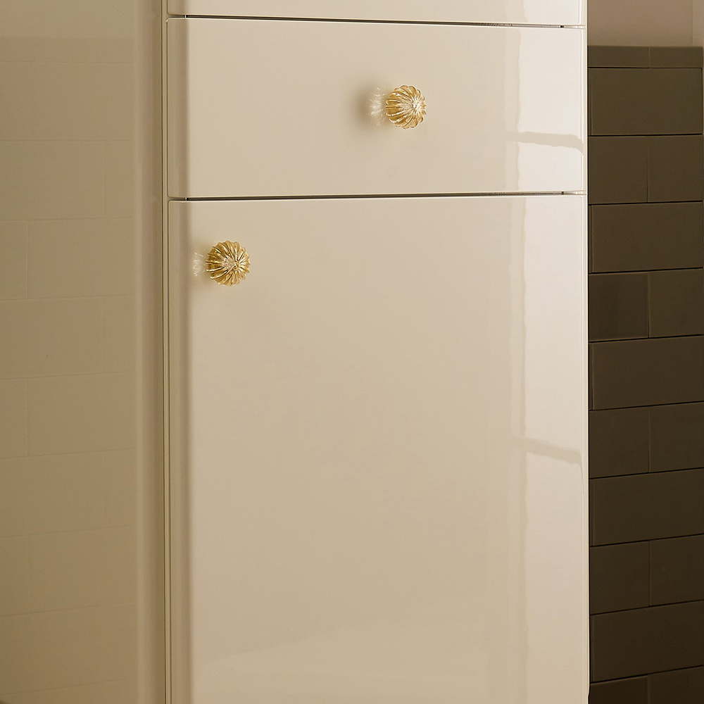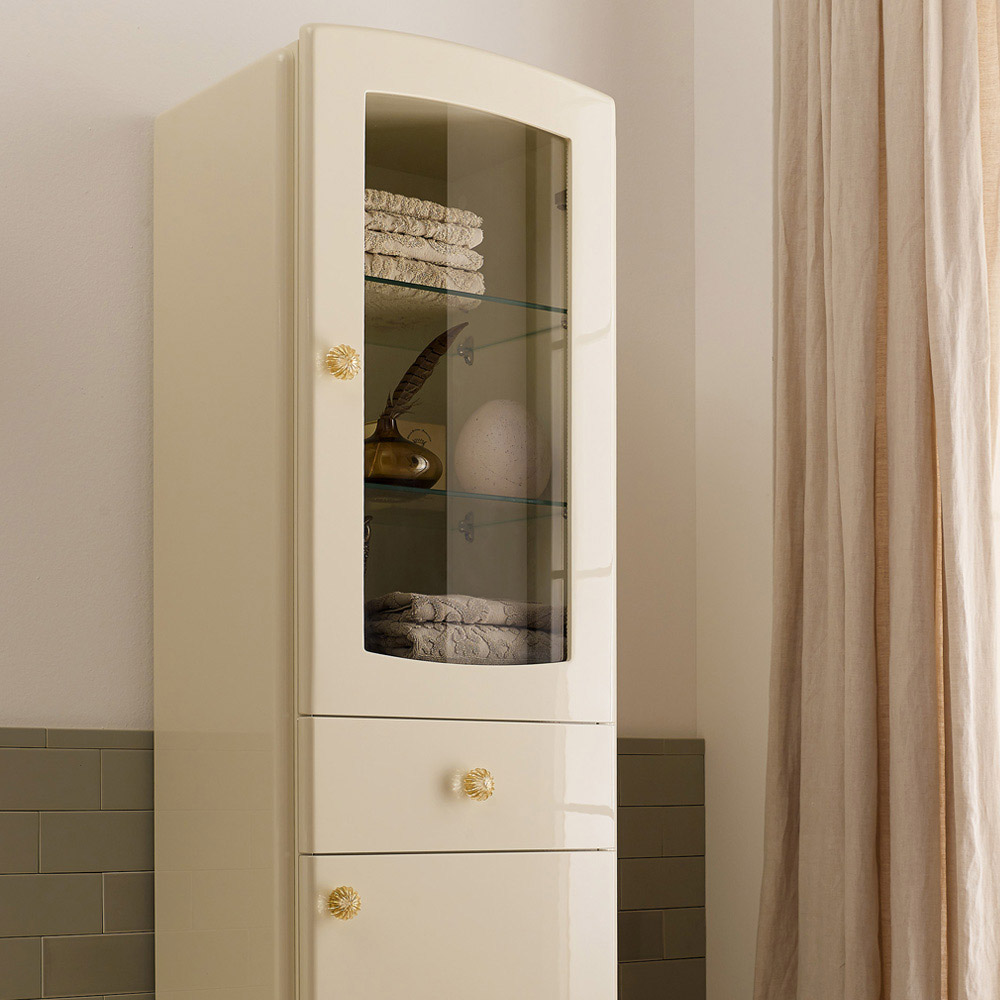 Vitrine h 180cm in MDF compleet met twee deuren , waarvan één met glas dat 2 glazen planken sluit, en een lade in het midden . De vitrine is in ivoor eenkleurig glanzend gelakt aan de buitenkant en mat gelakt aan de binnenkant met messing knoppen in de vorm van een gouden bloem inbegrepen.