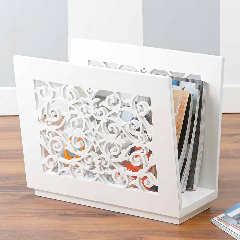 Vloer tijdschriftenrek in gevormd hout, waarvan de textuur doet denken aan een