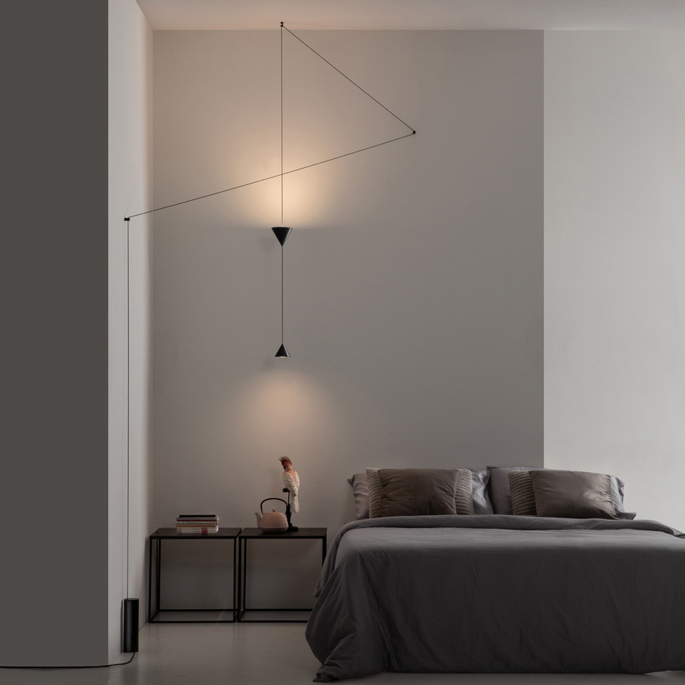 De kamer die als een wit laken wordt gezien, wordt ingenomen door de draad van de lamp die, als de markeringen van een potlood, de lijnen van de ruimte en omringende objecten volgt.