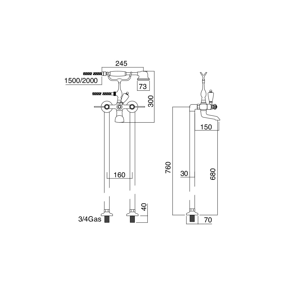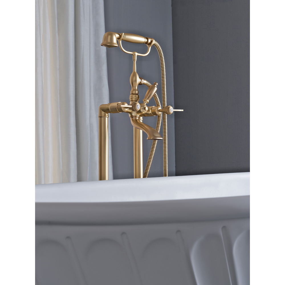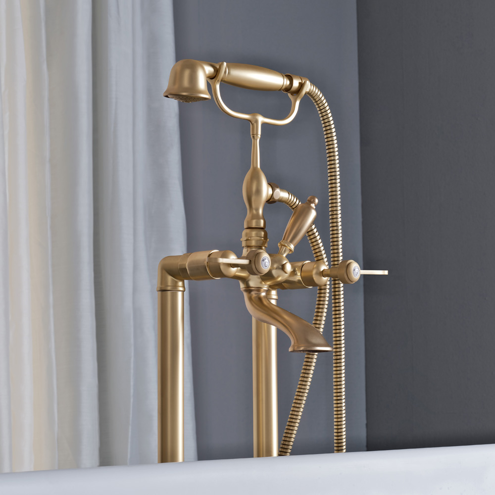 Vloer gemonteerde badkuip met handdouche en flexibel, gemaakt van zwaar messing, gegoten in mallen die de ambachtelijke systemen van het verleden respecteren en beschermd met een dikke afwerkingslaag mat messing.