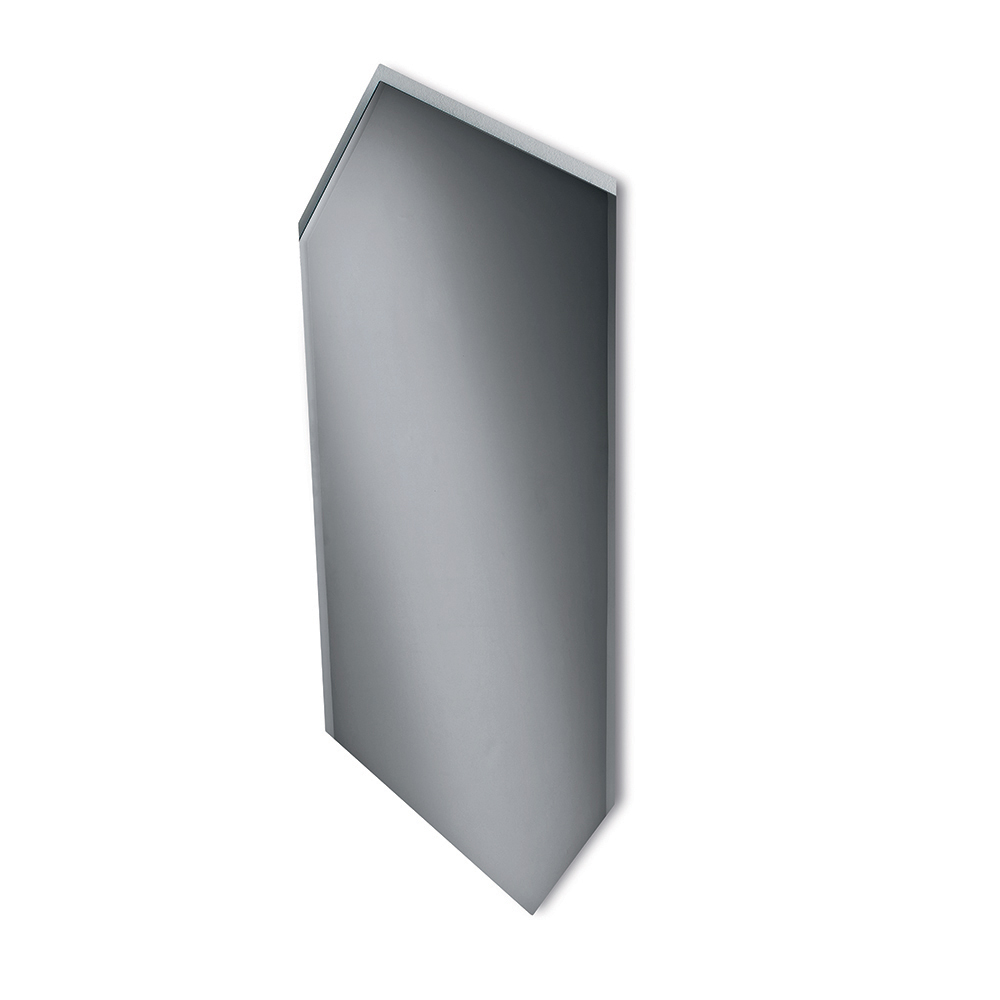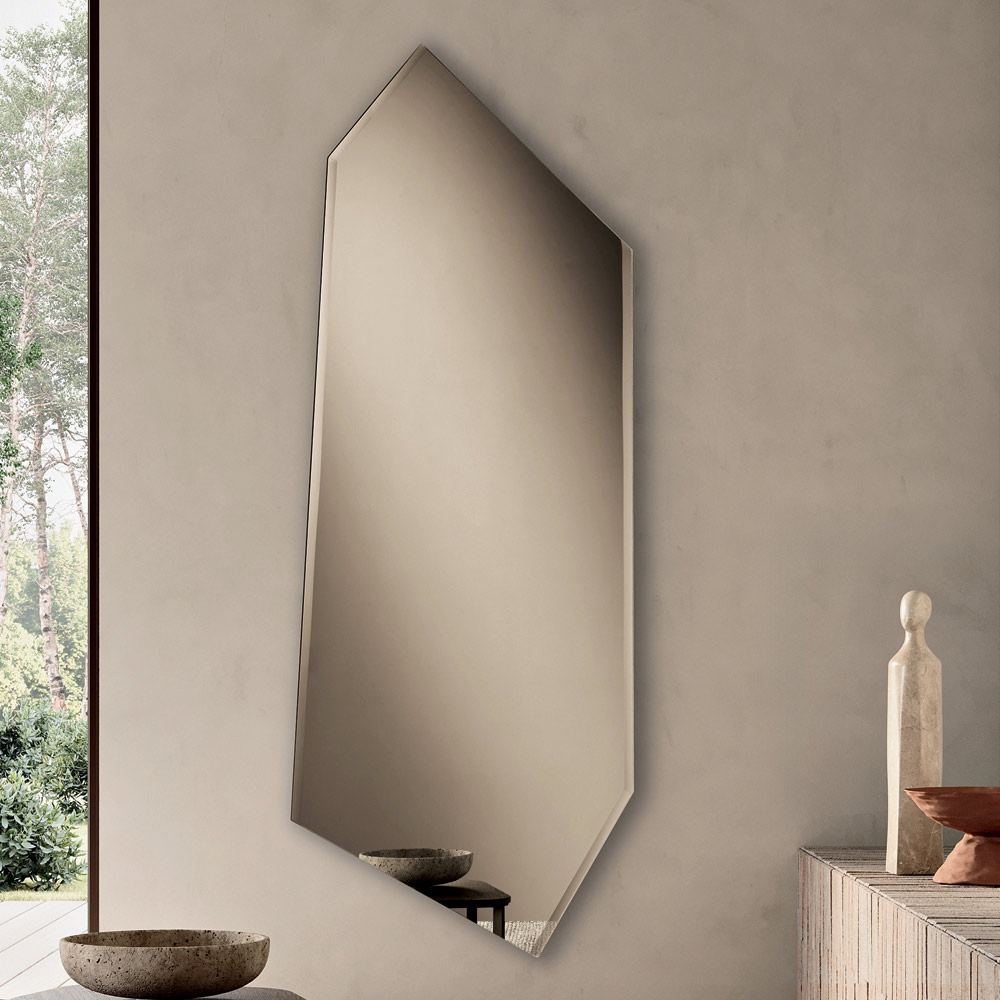 De spiegel heeft een onregelmatige vorm die doet denken aan een rechthoek die aan zes zijden open is, waardoor een modern en onconventioneel silhouet ontstaat. Het profiel is aan vier zijden gedeeltelijk afgeschuind, een subtiel maar verfijnd detail dat de contouren accentueert en het reflecterende oppervlak extra glans geeft.