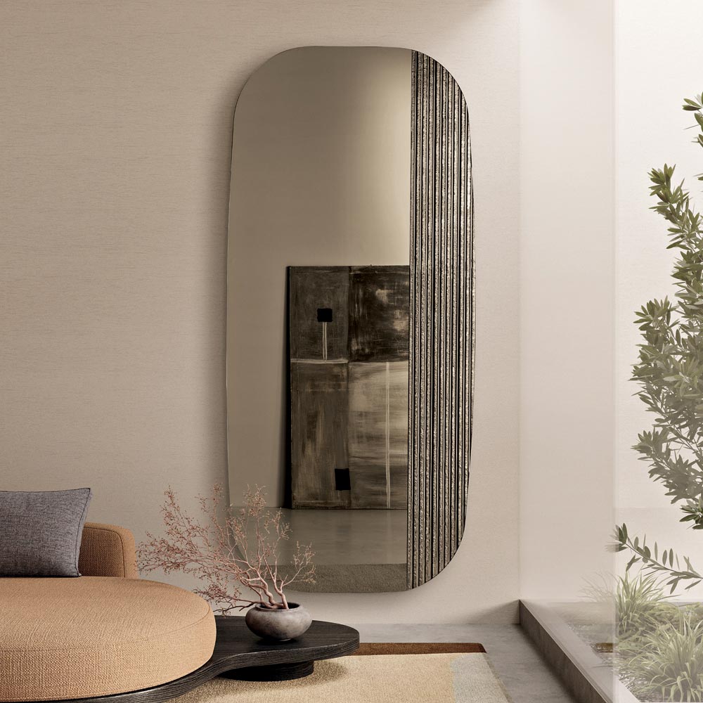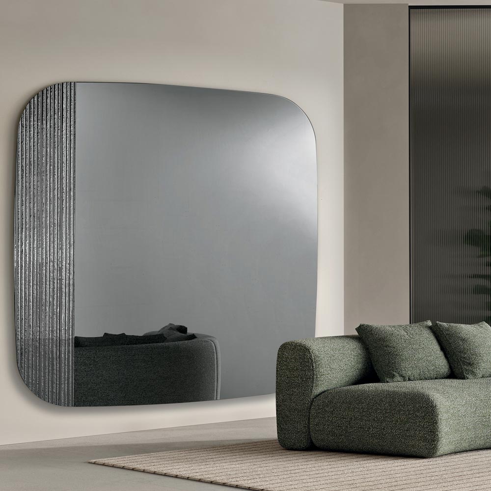 Het reflecterende oppervlak heeft een voorgevormde vorm met zacht afgeronde hoeken , ontworpen om een subtiel en harmonieus visueel effect te creëren. Het ontwerp is verfraaid met een toon-op-toon, aan de achterzijde verzilverd, geribbeld glazen inzetstuk dat diepte en dynamiek toevoegt en een verfijnd samenspel van licht en textuur op het spiegeloppervlak creëert.