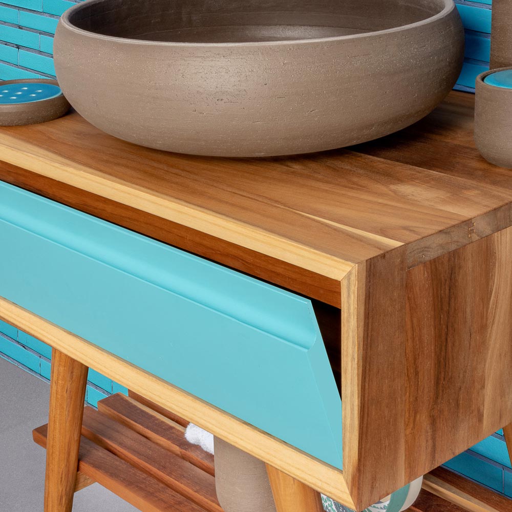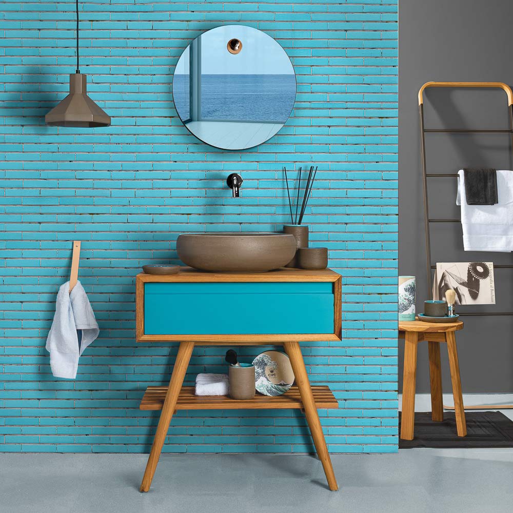 Staande badkamerkast gemaakt van natuurlijk hersteld teakhout met kleplade in blauw mahoniehout , een kleur die verwijst naar de rust en sereniteit geassocieerd met natuurlijke elementen zoals water en lucht en biedt ontspannende effecten, emoties die verwijzen naar charme overheersend van de natuur. De structuur wordt gekenmerkt door eenvoudige vormen en praktische ruimtes, ideaal om de badkamer op een elegante en functionele manier te organiseren voor een origineel resultaat met een sterke moderne persoonlijkheid .