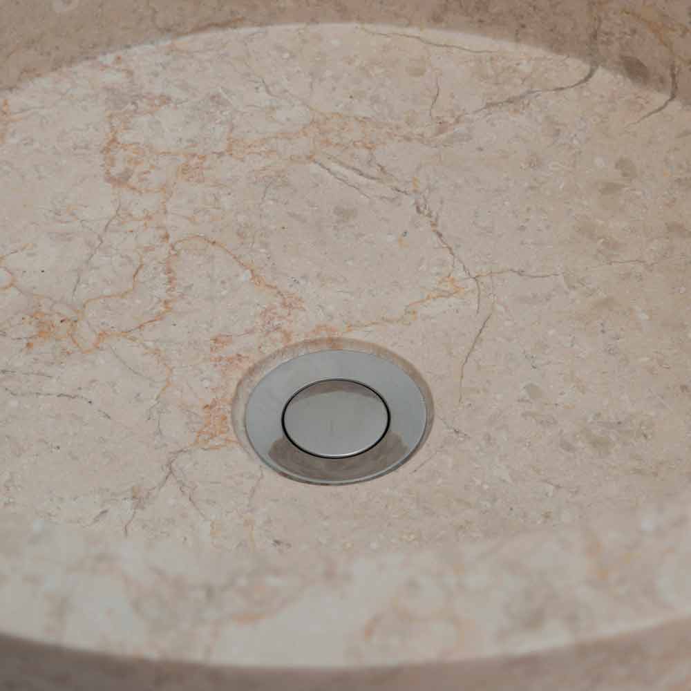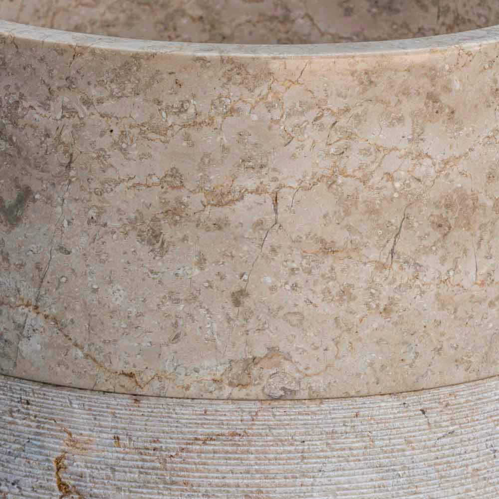 Vrijstaande marmeren spoelbak in de kleuren ivoor tot crème en warme schakeringen. De eerste "het bassin" bestaat uit twee delen en is van gepolijst marmer, zowel aan de buitenkant als aan de binnenkant. Het tweede deel is de "basis" gemaakt door het ruwe marmer te decoreren met een draaiend effect. Het type verwerking dat voor de basis wordt gebruikt, kan scheuren of barsten in het marmer veroorzaken die de integriteit of veiligheid van de gootsteen op geen enkele manier in gevaar brengen. Dergelijke situaties worden niet beschouwd als productgebreken.