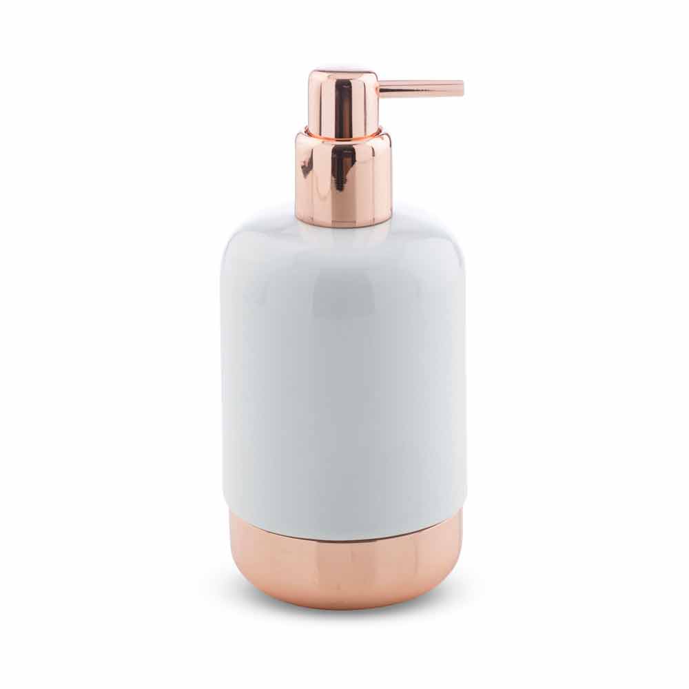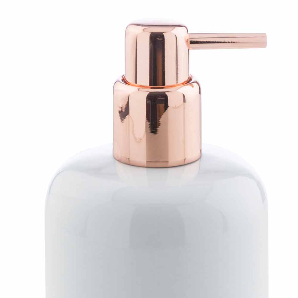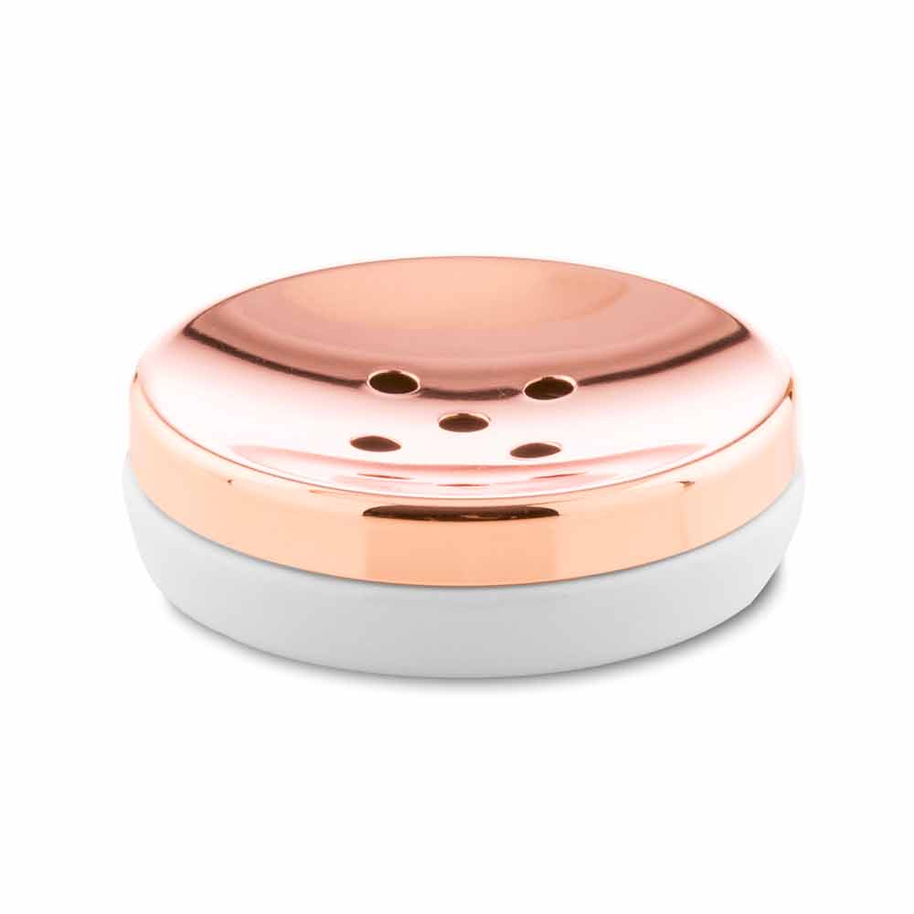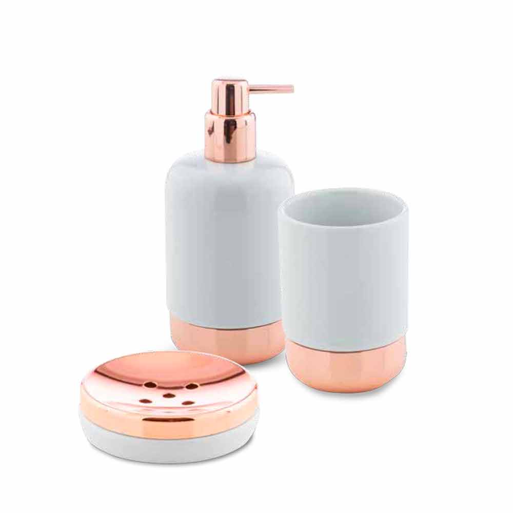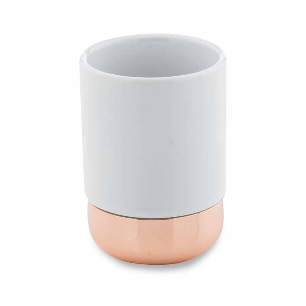 Vrijstaande badkameraccessoires van keramiek en gepolijst koper.