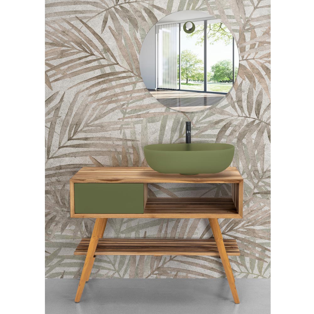 Staande badkamerkast met structuur gemaakt van gerecycled natuurlijk teakhout met zijlade in groen mahoniehout , een tint die in elk detail aan het Oosten herinnert. Een opzettelijk grafische esthetiek die nog meer wordt versterkt door de praktische afmetingen ervan, waardoor het perfect is voor het inrichten van kleine ruimtes die een elegante en functionele hoofdrolspeler nodig hebben.