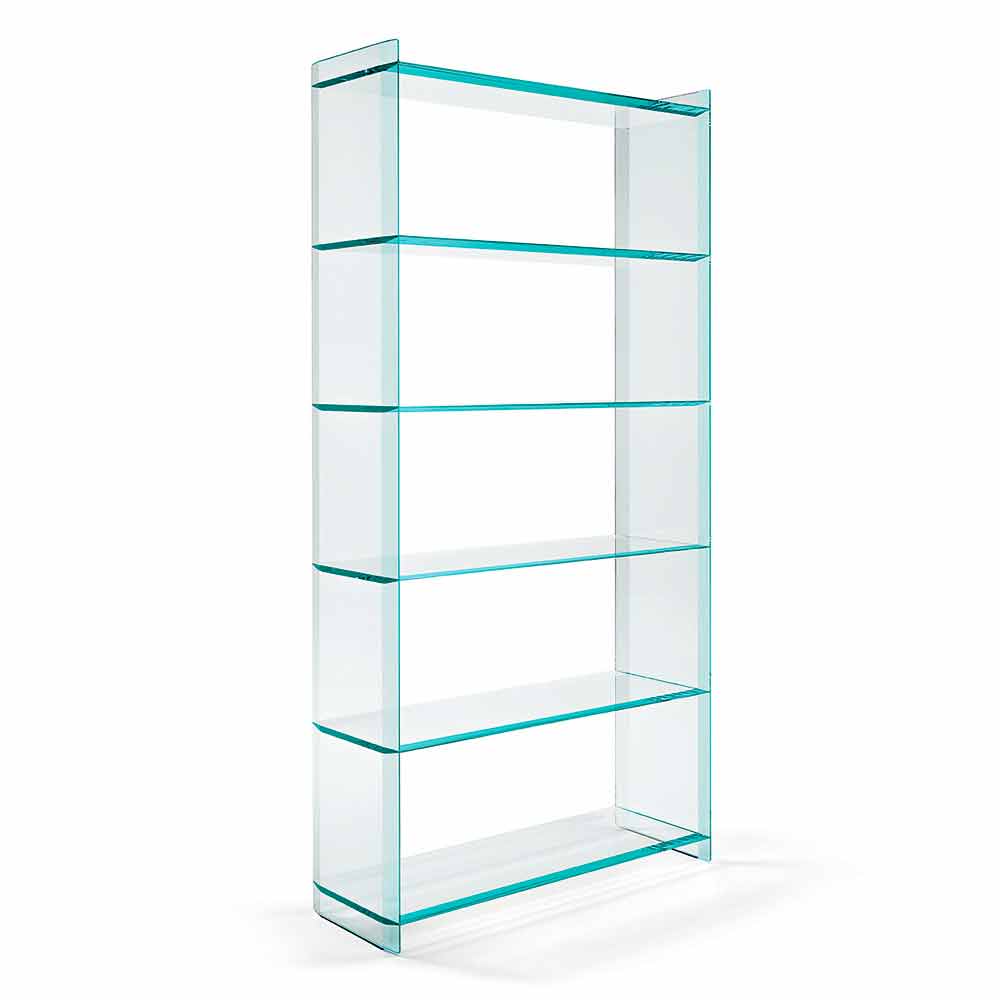 Deze boekenkast in de woonkamer wordt gekenmerkt door zijn intrigerende en elegante ontwerp, volledig gemaakt van extra helder glas met een schuine rand van 5 cm.