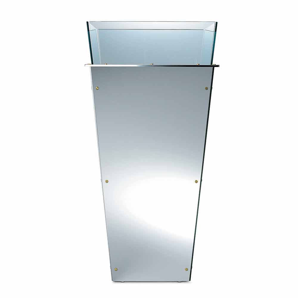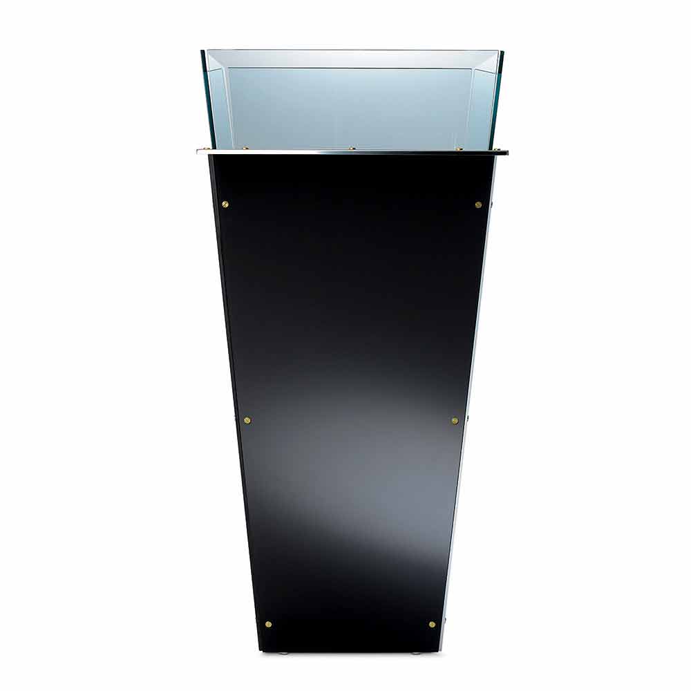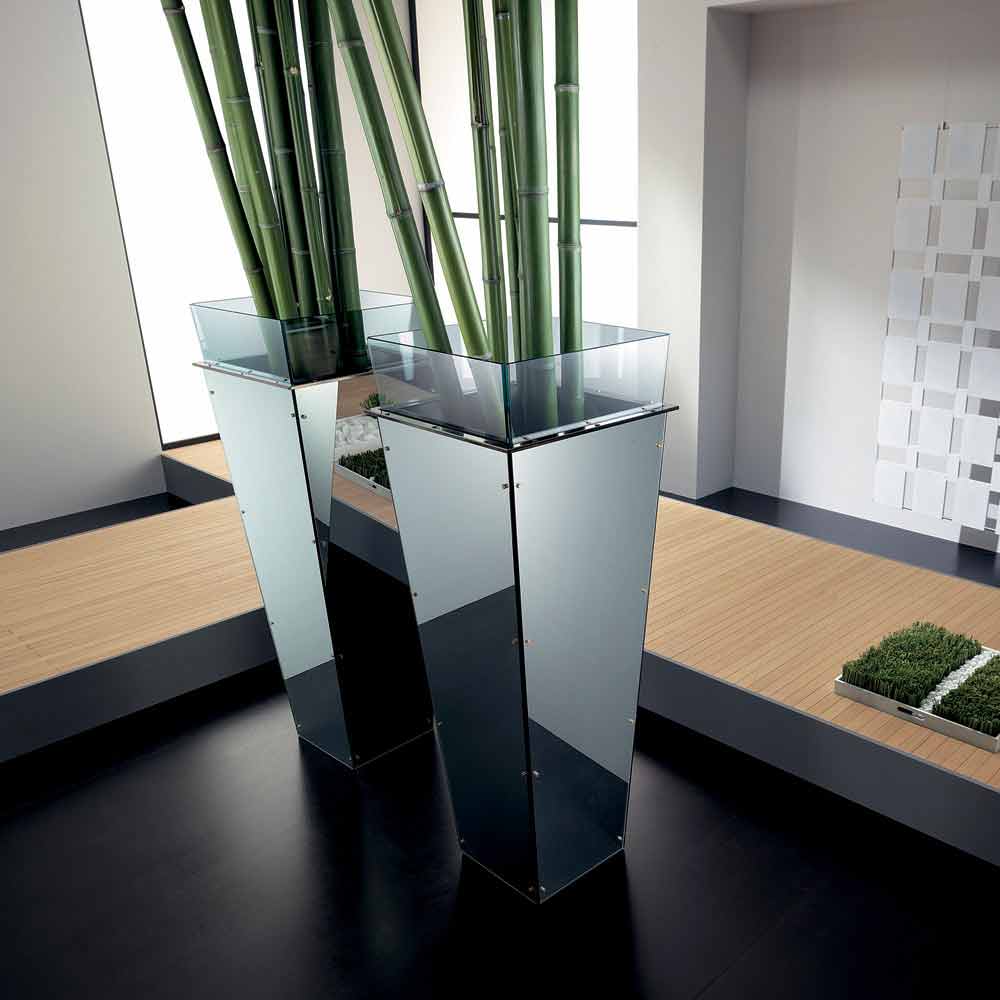 Deze vrijstaande vaas verkrijgbaar in verschillende maten wordt gekenmerkt door verwisselbare zijpanelen in meerdere afwerkingen zoals: zwart gelakt glas, wit gelakt glas, spiegel of leer.