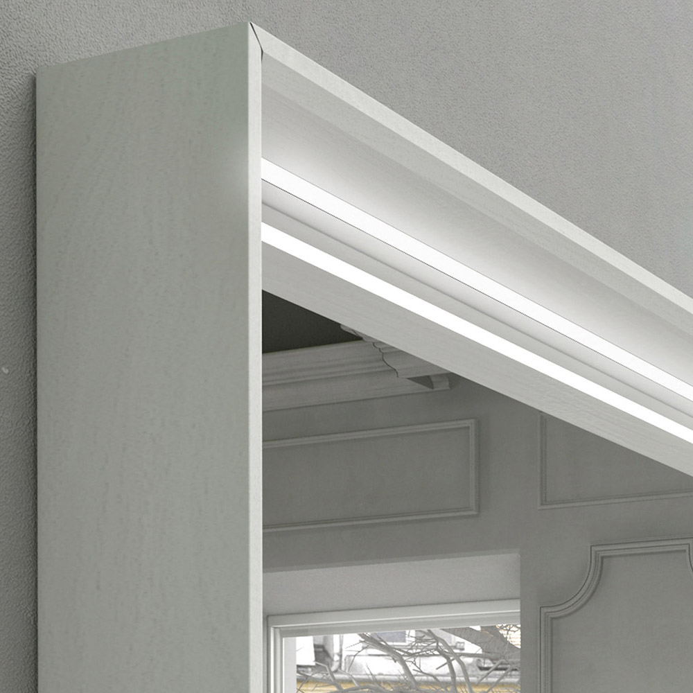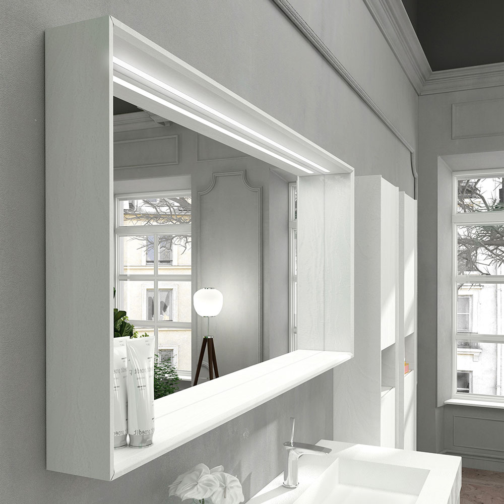 Rechthoekige wandspiegel voor badkamer met LED licht en witte houten rand, luxe made in Italy.