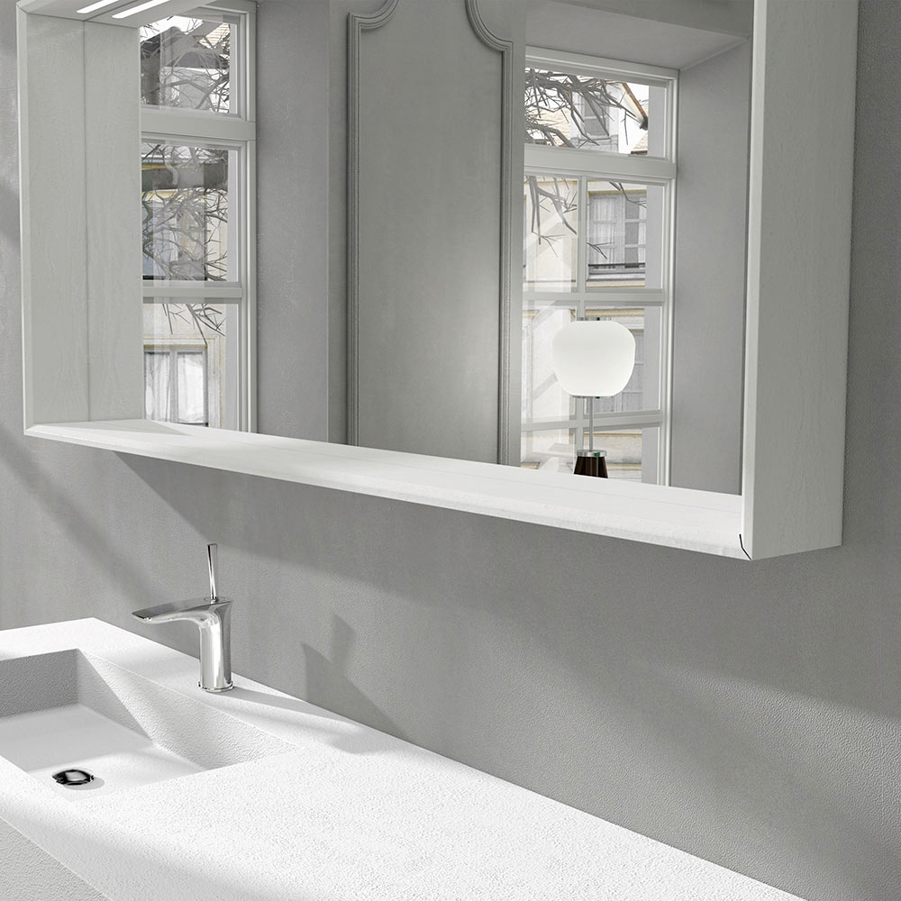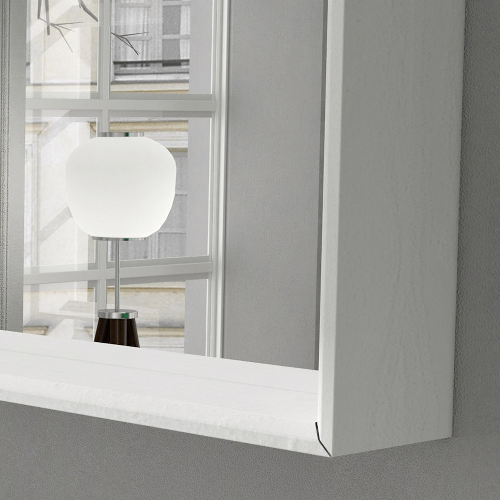 rechthoekige design wandspiegel, verkrijgbaar in twee maten, wordt gekenmerkt door zijn elegante doosvormige frame in mat wit gelakt hout wat hem een moderne en originele uitstraling geeft.