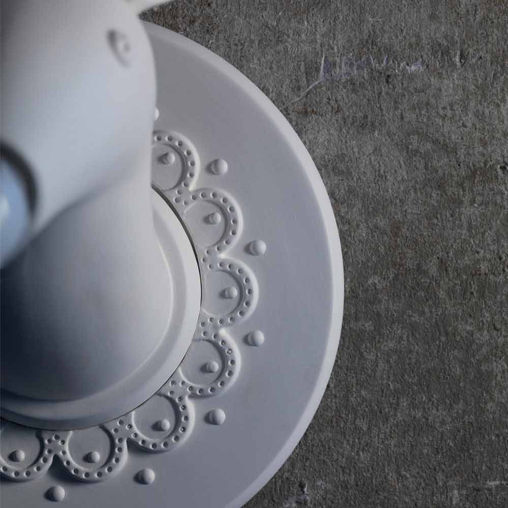 De lamp is gemaakt van ondoorzichtig wit keramiek als materiaal dat de oorsprong, de maakbaarheid, de creatie vertegenwoordigt en dat rechtstreeks leidt naar de oorsprong van onze cultuur.