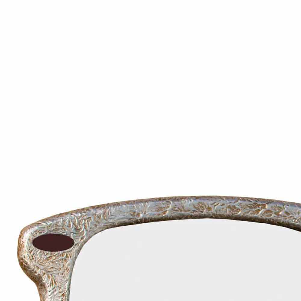 Spiegel gekenmerkt door geweldige stijl en elegantie. Gemaakt van MDF, een zeer bestendig en onveranderbaar materiaal in de loop van de tijd, met gevormde structuur en met de hand gedecoreerd met zilveren blad op materiaal met textuur, aangenaam om aan te raken en aangenaam om te zien.